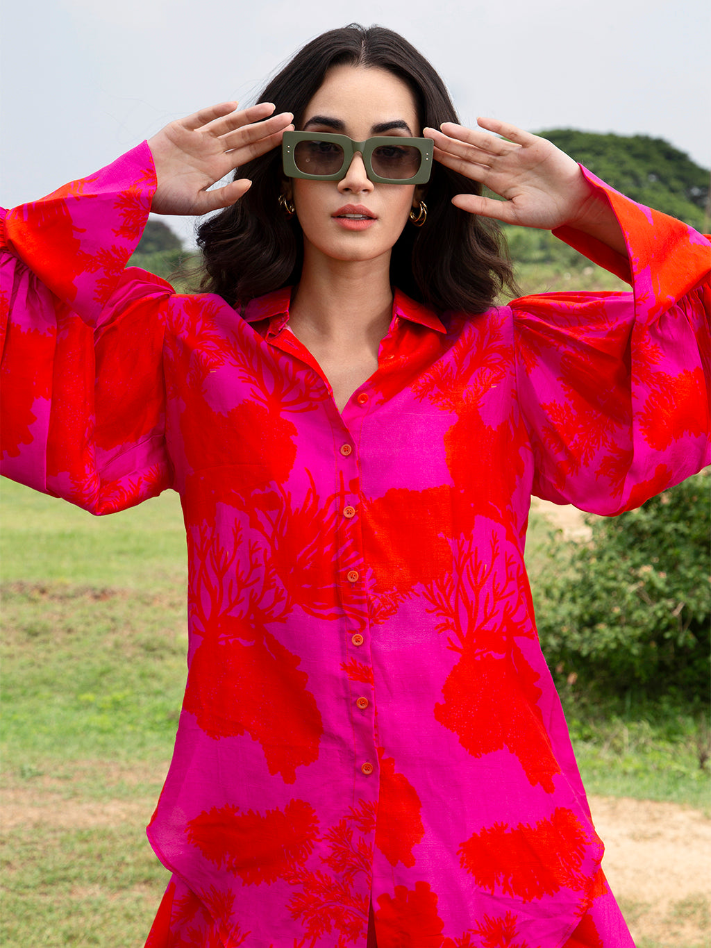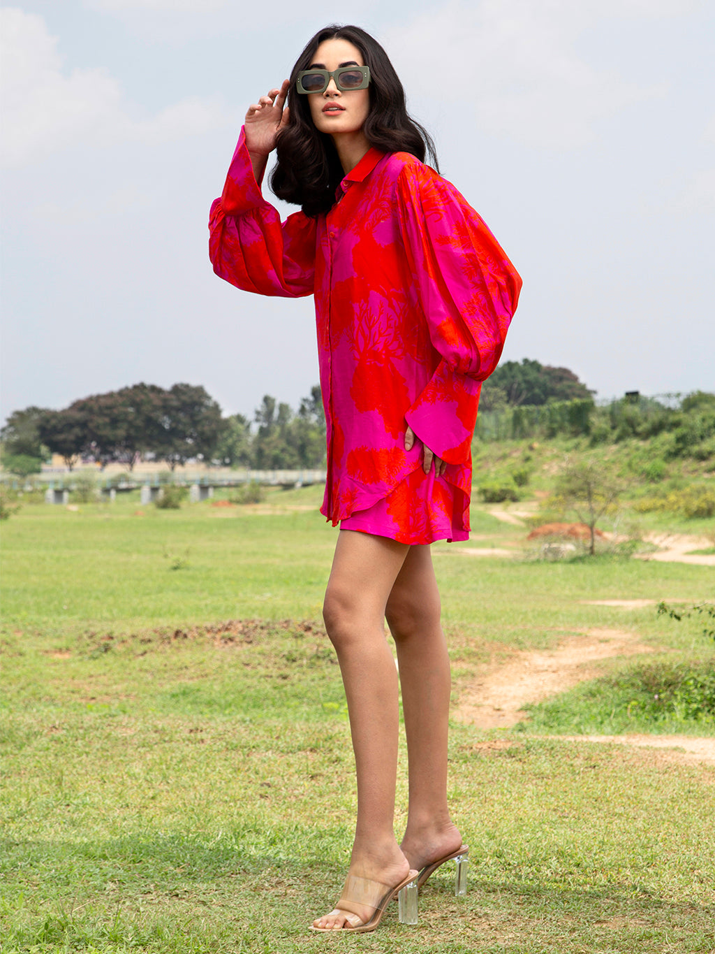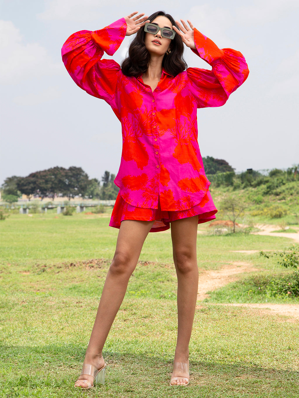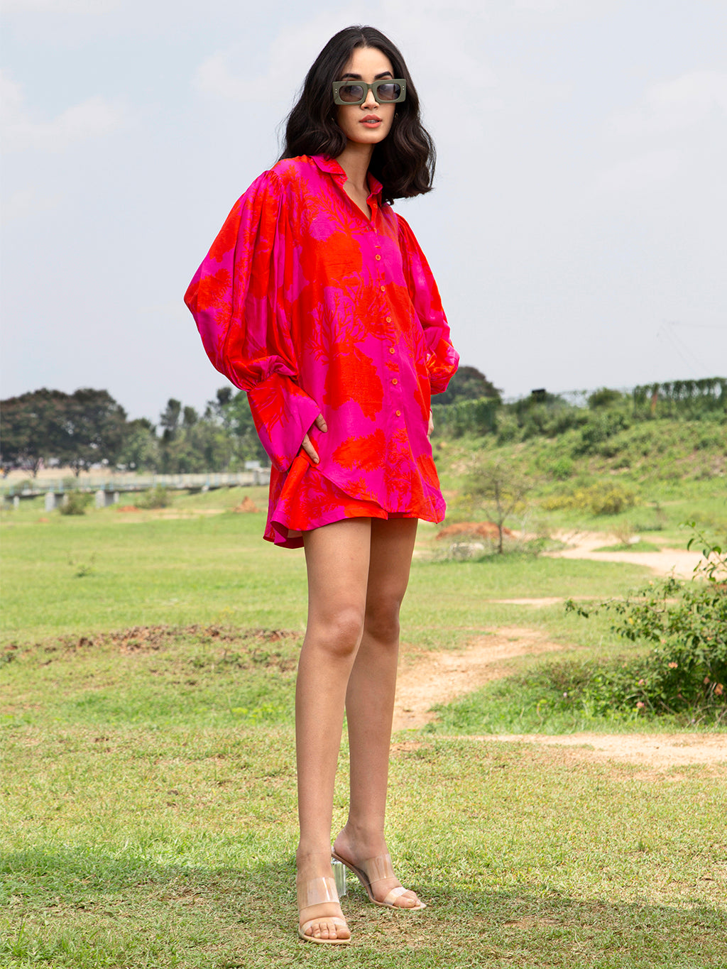 The pink poppy co ord set comes with a buttoned down shirt and shorts that can be styles in different ways , made of luxurious bemberg silk this 2 piece set is sure to glam you up .