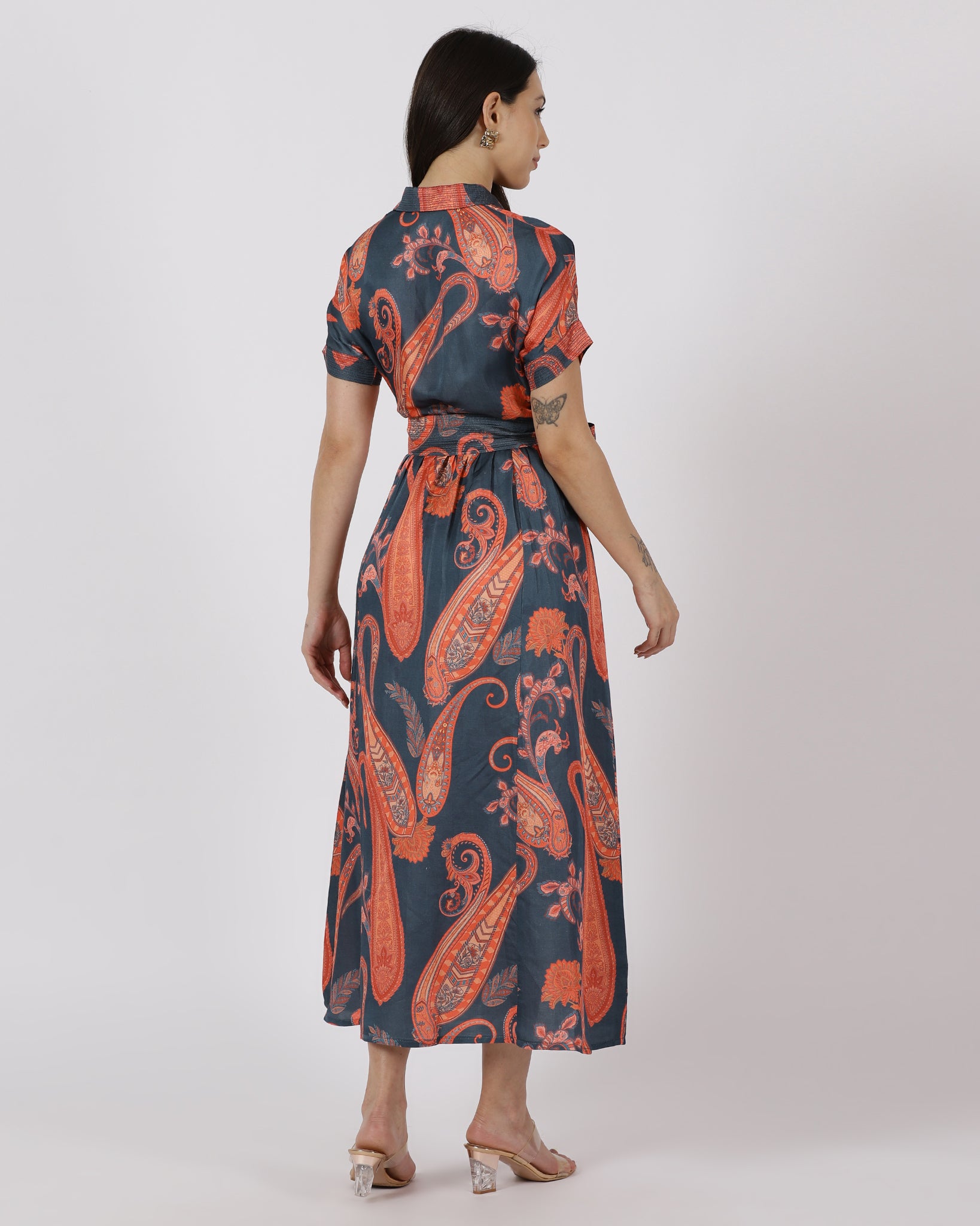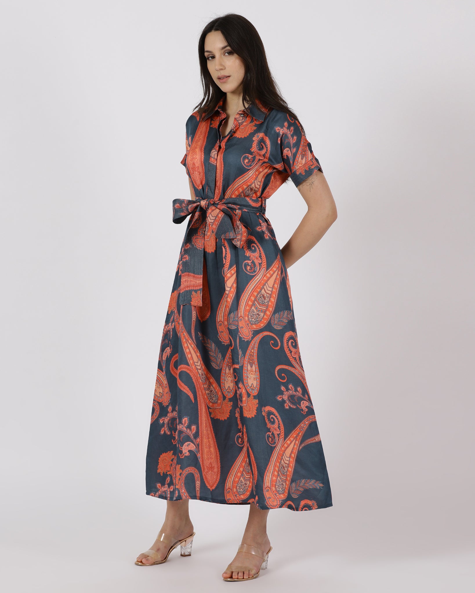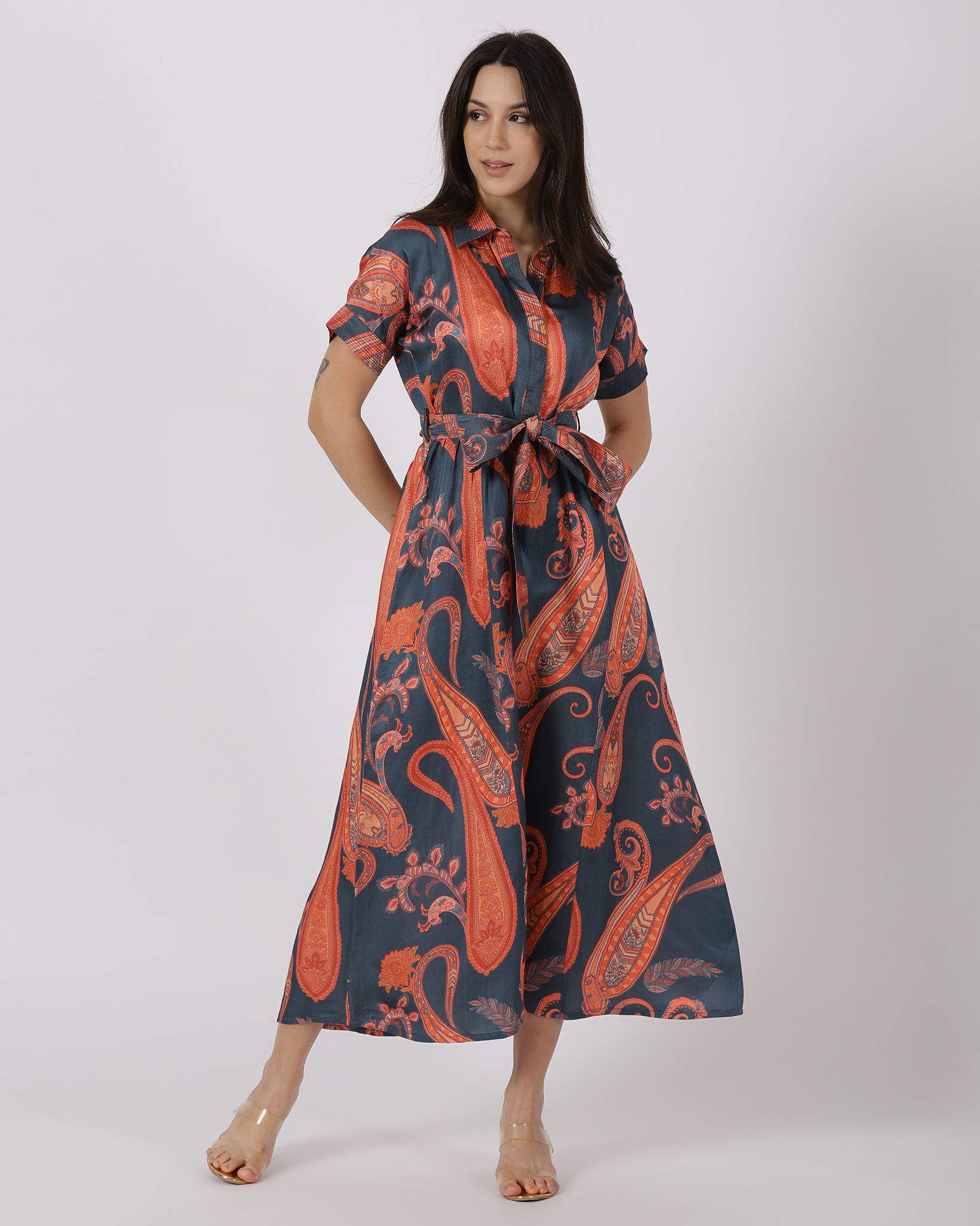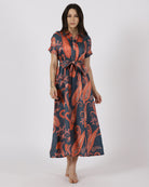 The Terra Bloom Shirt Dress combines a tailored shirt collar with a cinched waist tie to create a structured yet feminine silhouette. The bold paisley print adds visual depth, while the soft, fluid fabric ensures flattering movement. A versatile dress that transitions seamlessly from day to dinner.