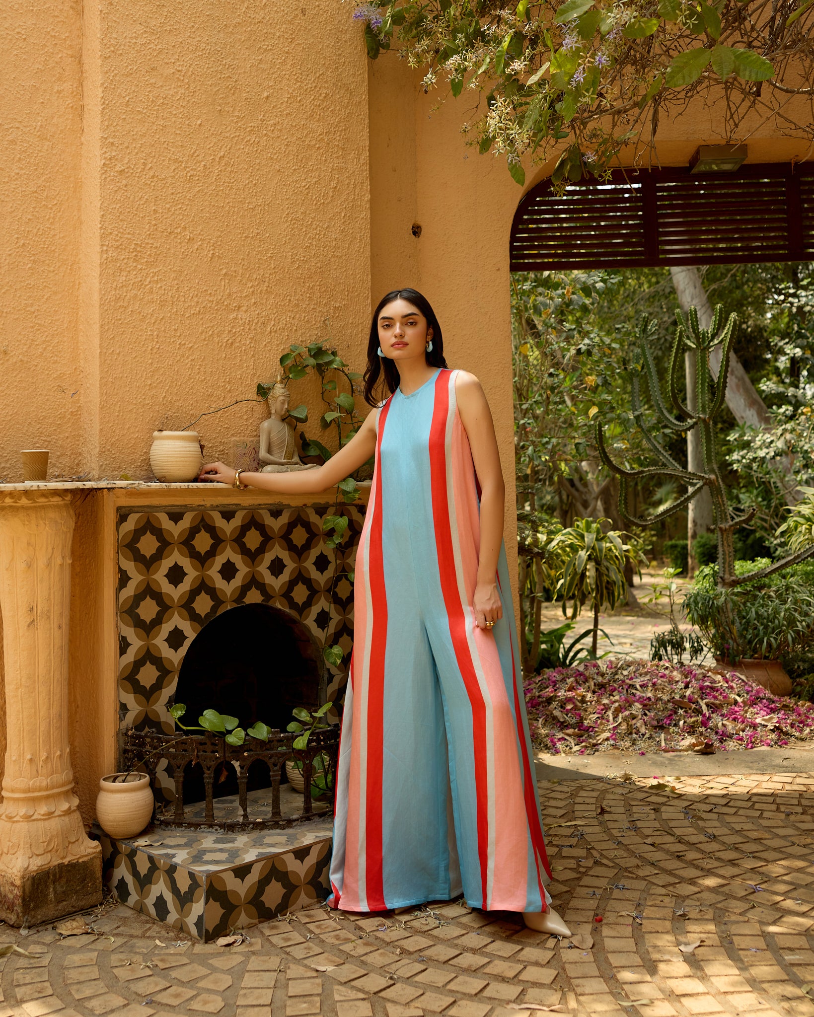 The Coral Ribbon Jumpsuit is crafted in linen satin and painted in soft shades of coral, bringing a breezy charm to the silhouette.