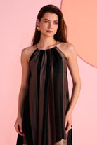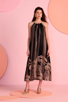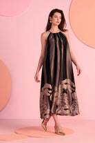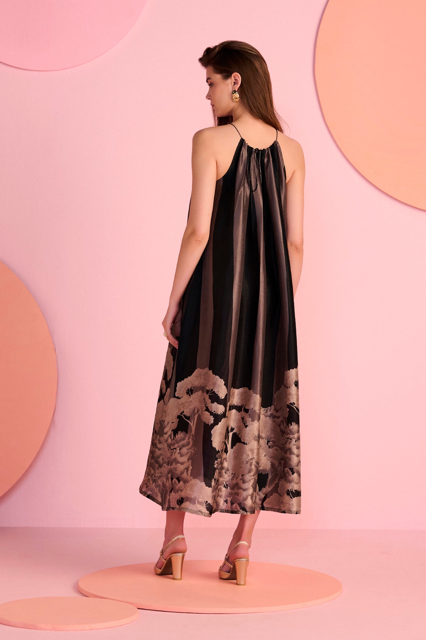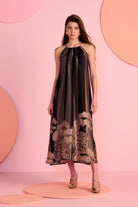 The Black Willow Dress features a graceful halter neckline with a fluid silhouette that falls effortlessly for an elegant and refined look. Designed with soft gathers at the neckline and a striking botanical border print, this dress brings together understated sophistication and statement detail. Its airy structure and graceful movement make it a versatile choice for evening gatherings and special occasions. Crafted with silk.