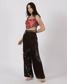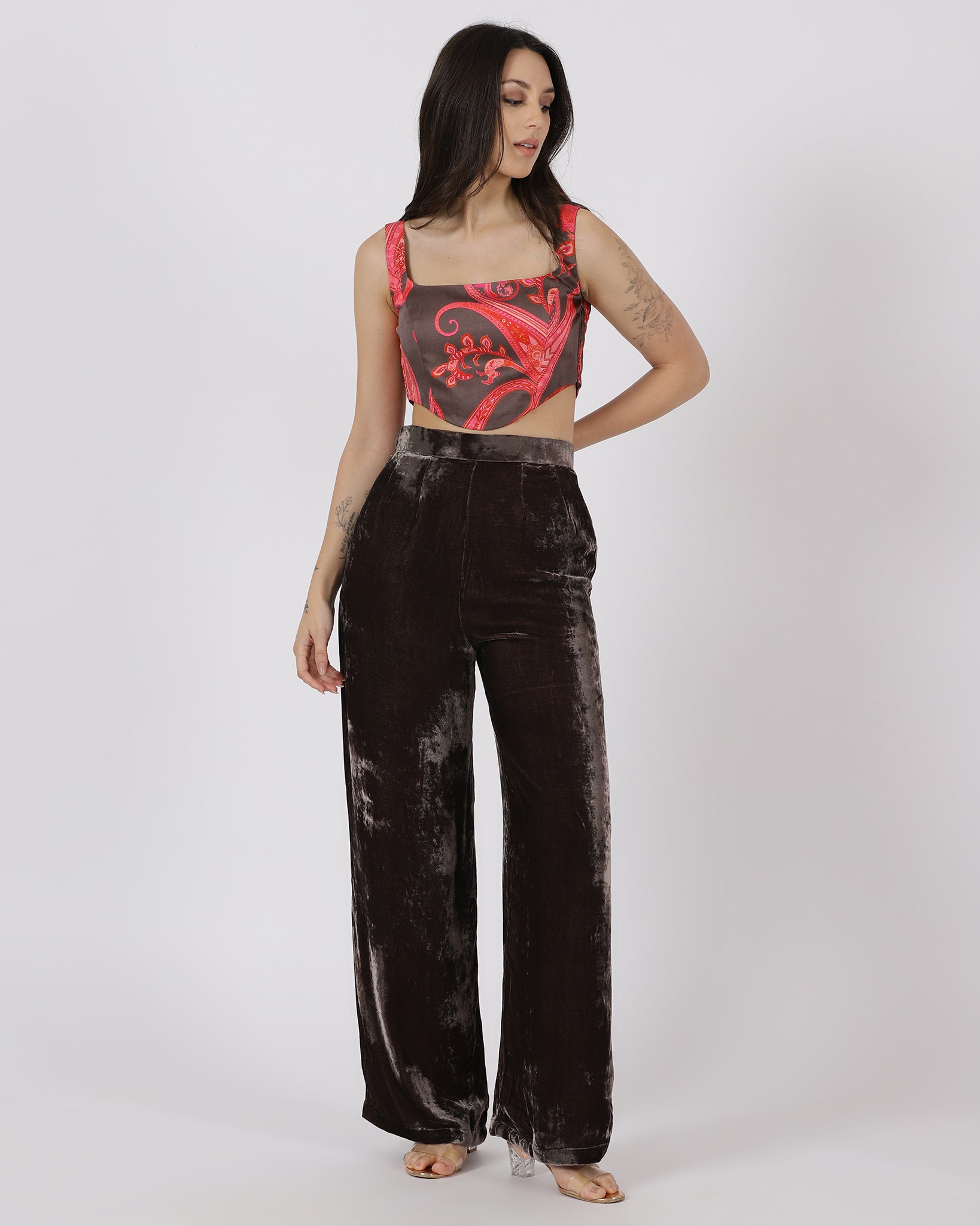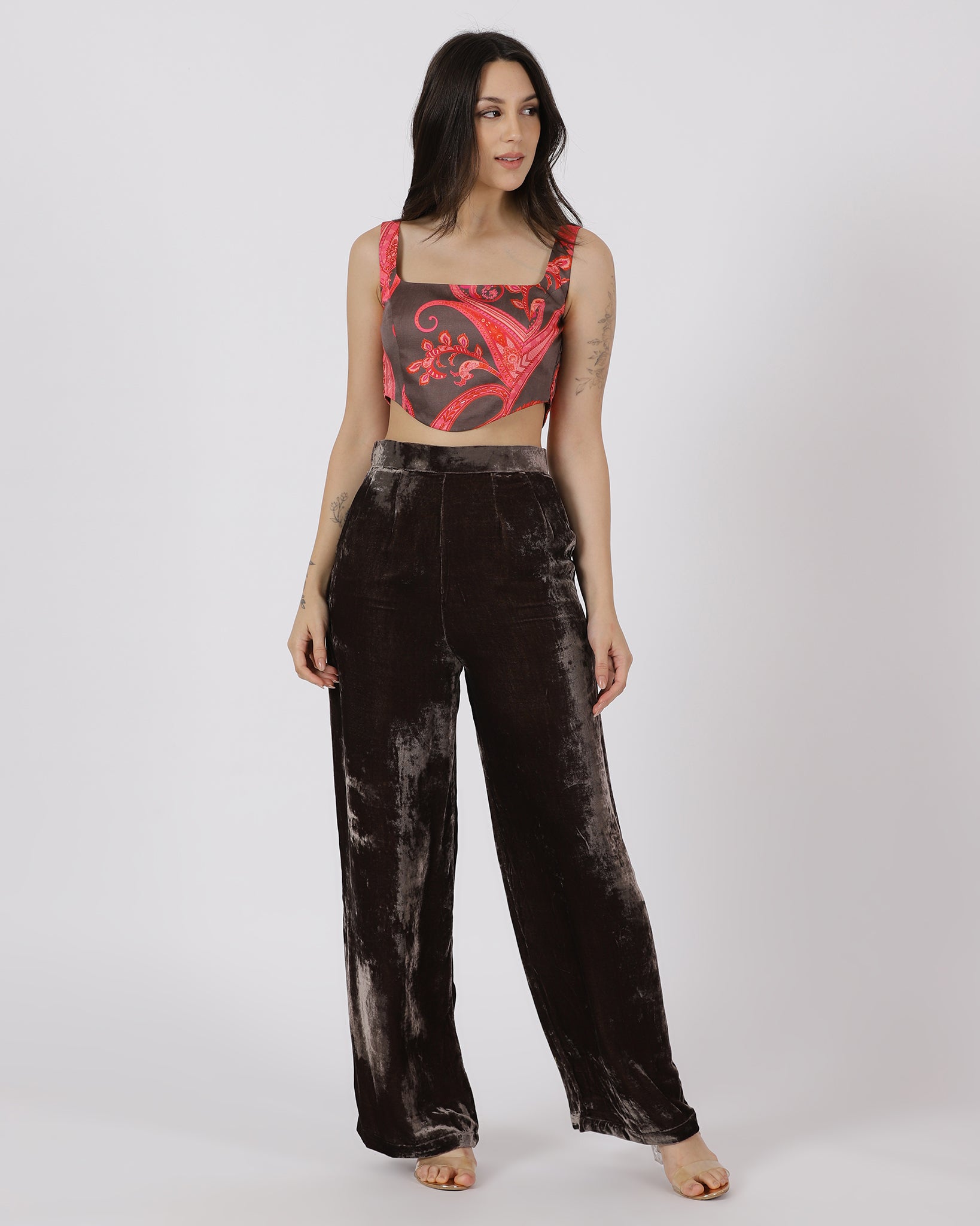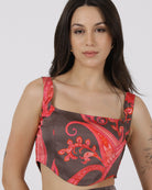 The Crimson Crest Bustier features a striking paisley motif in bold red tones, sculpted into a flattering square-neck silhouette. The structured bodice adds definition while maintaining ease, making it a standout piece for elevated evenings or chic holiday dressing. Paired seamlessly with trousers or skirts, it offers a refined yet playful charm.
