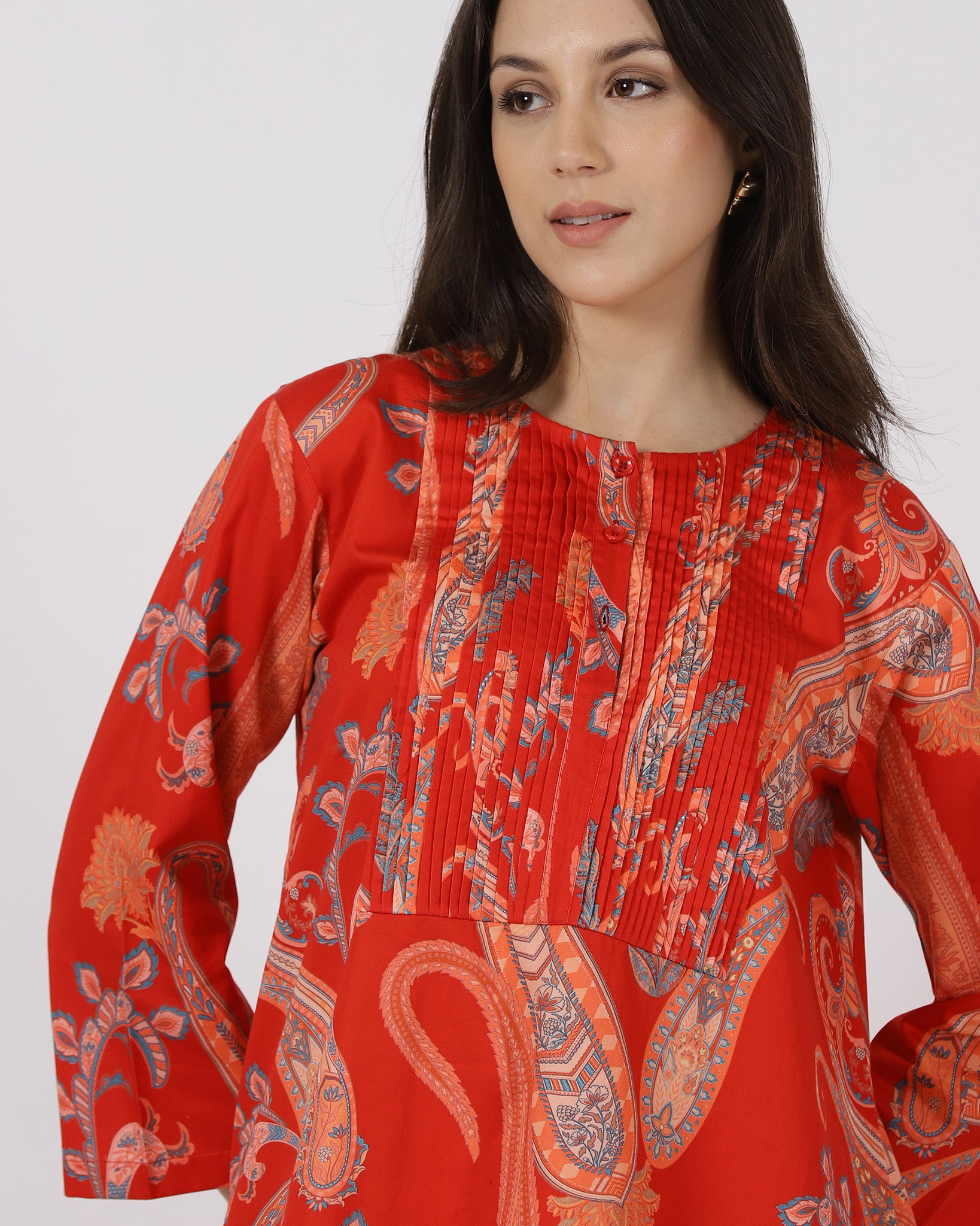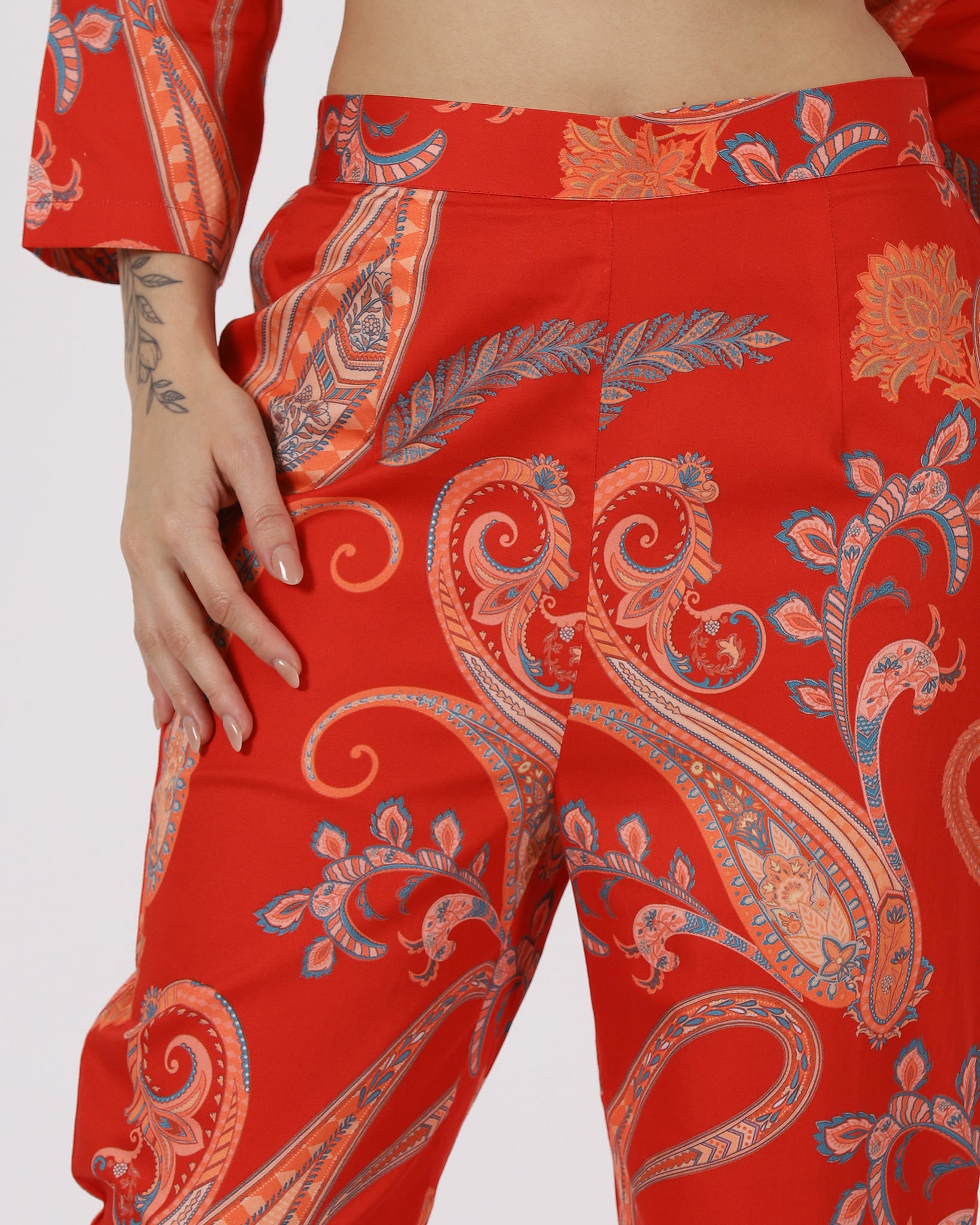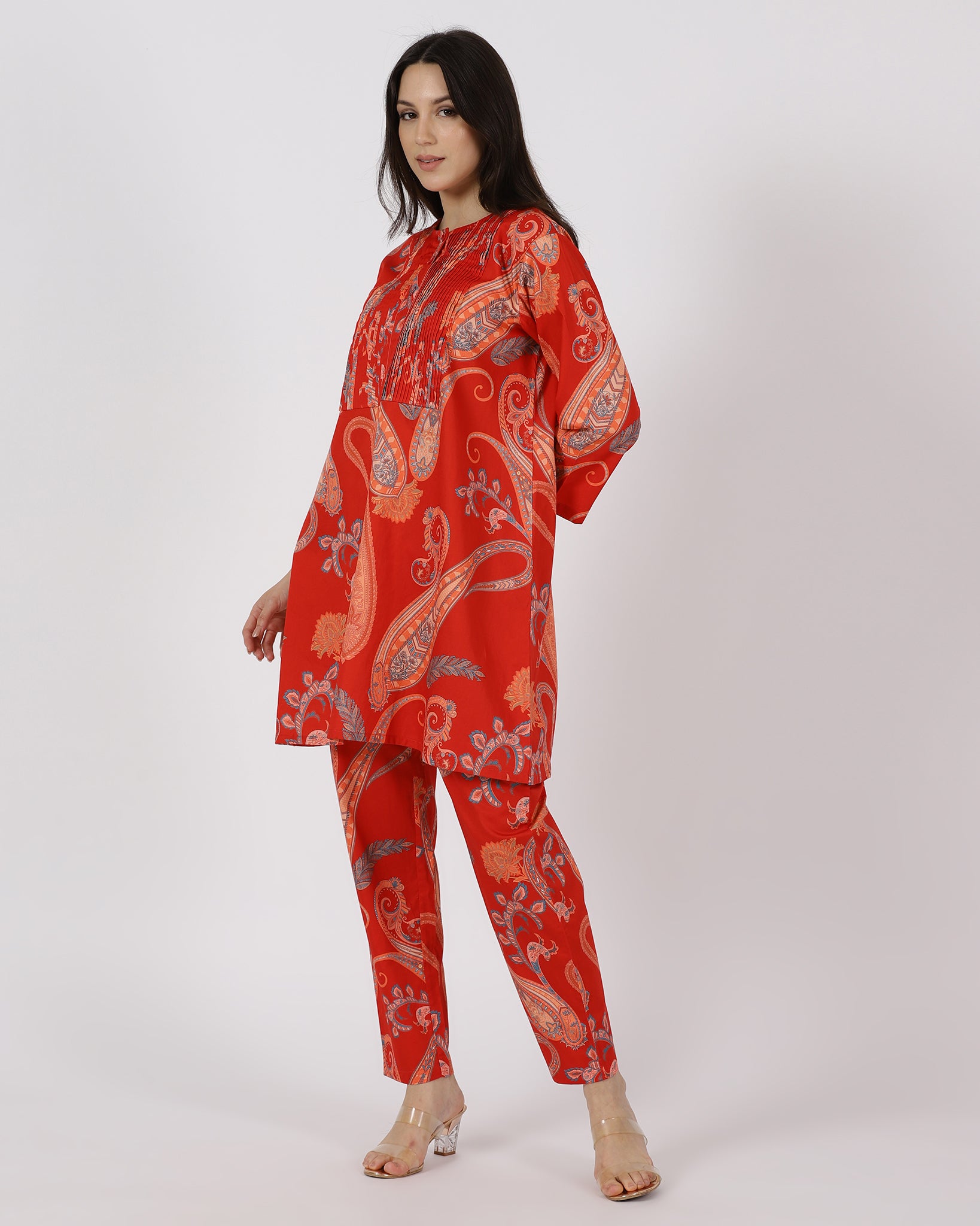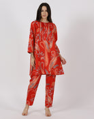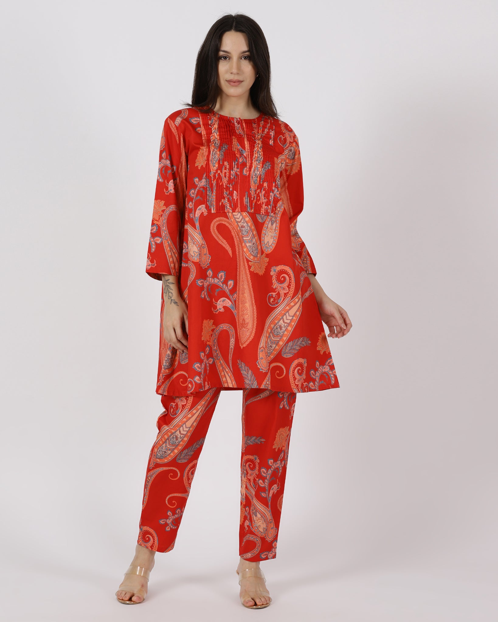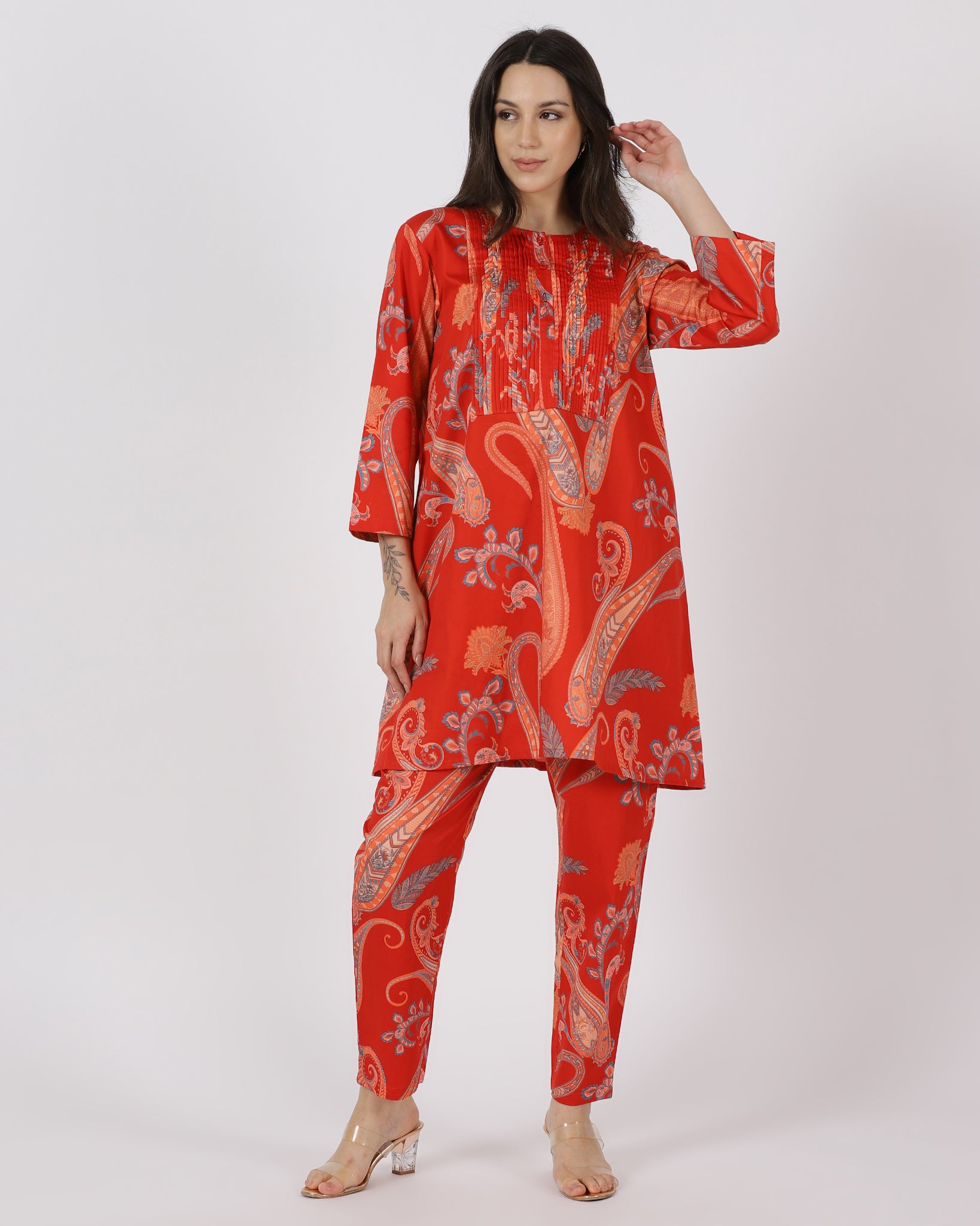 The Ember Muse Co-ord Set brings together a structured A-line top with delicate front ruching and beautifully coordinated straight pants. Crafted in rich paisley, this set balances comfort with refined detailing. A polished, modern silhouette made for days that call for effortless sophistication.