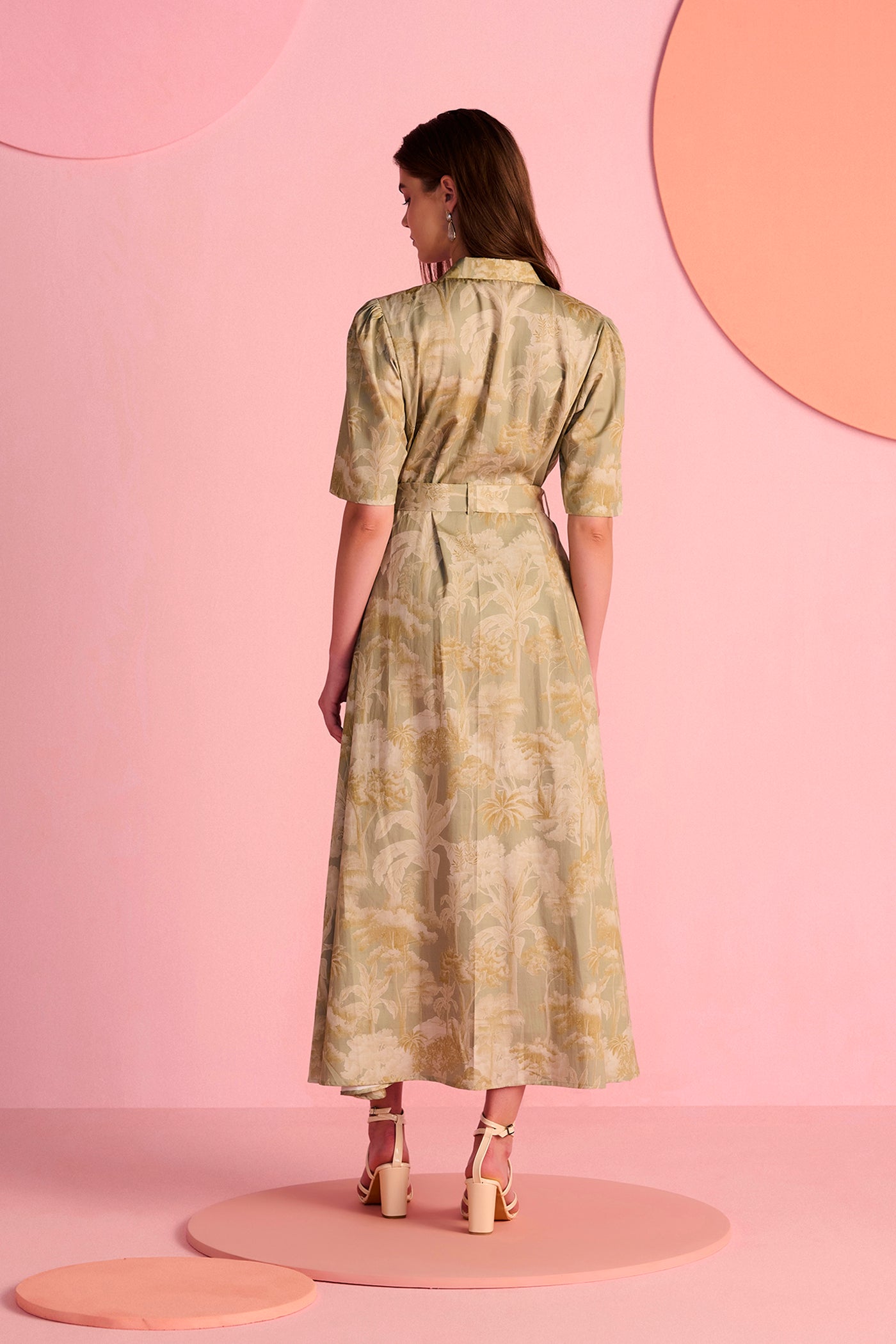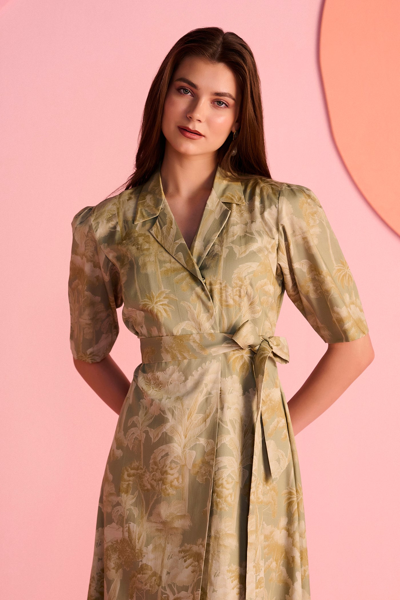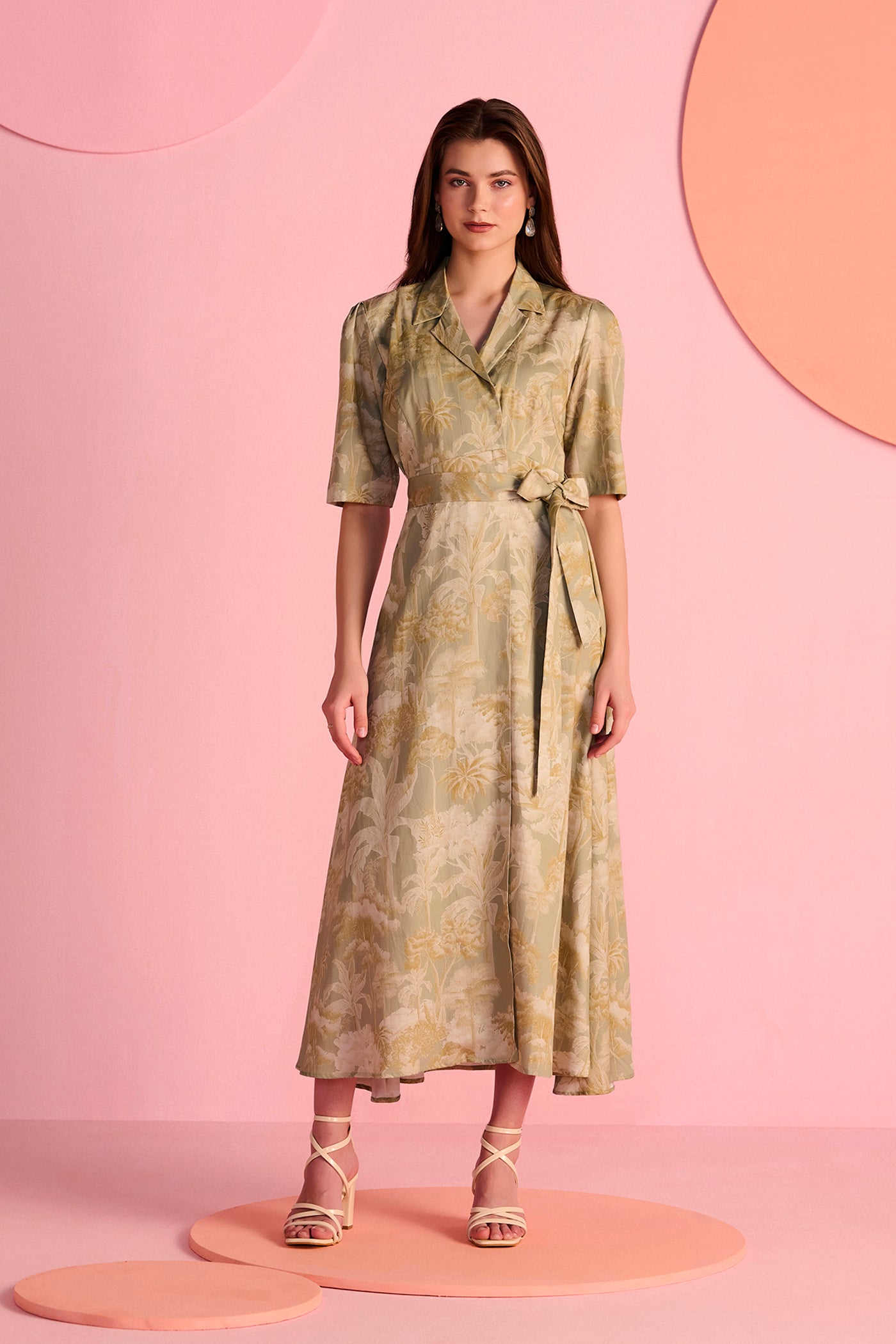 Bring effortless elegance to your wardrobe with our wrap-inspired dress crafted in a soft sage tone and delicate botanical print. Designed with a structured collar, graceful silhouette, and a detachable belt that defines the waist, this dress offers versatile styling with a refined finish. The front slit adds fluid movement, making it a perfect choice for daytime gatherings and elevated occasions. Crafted with cotton.