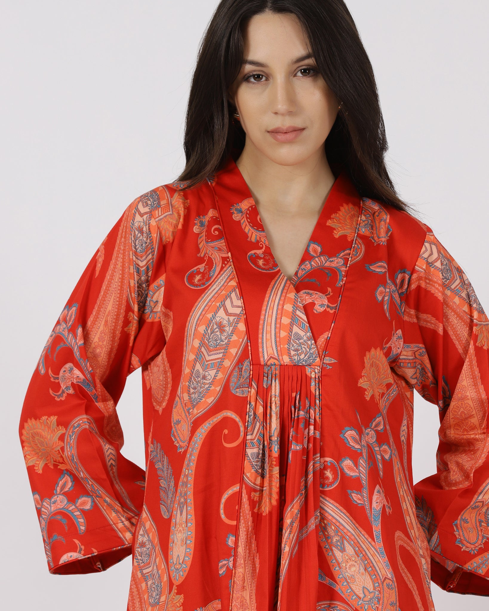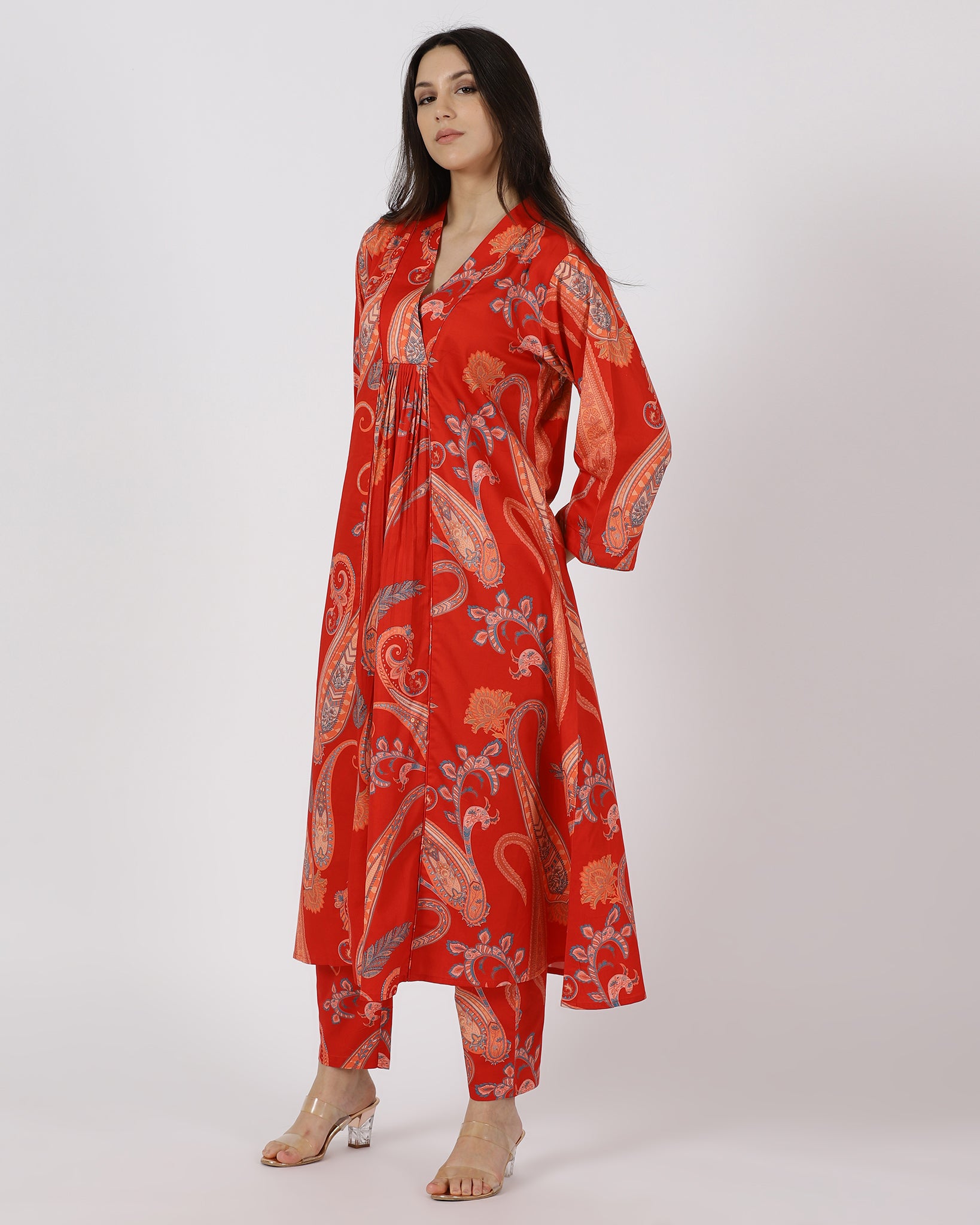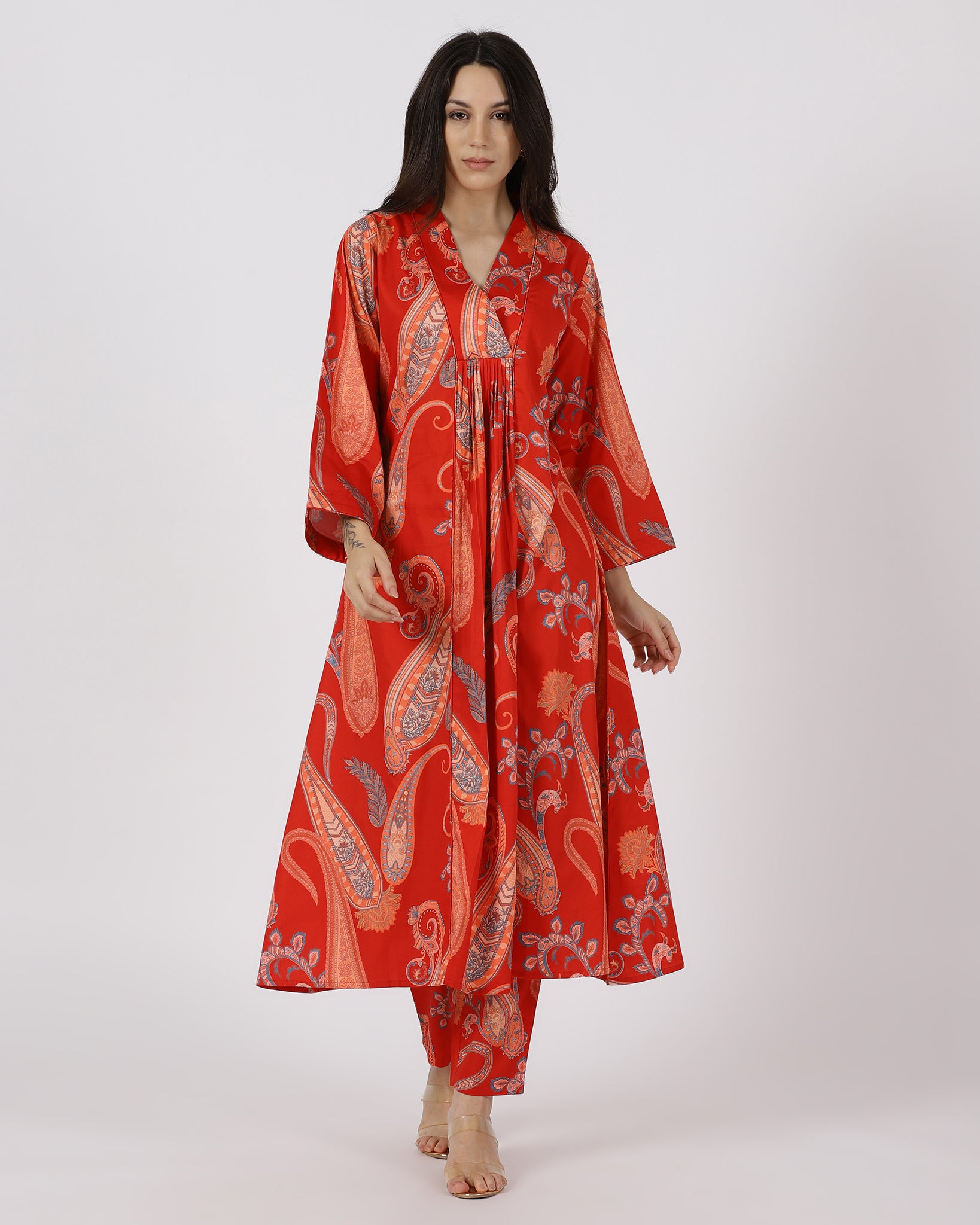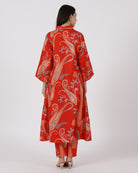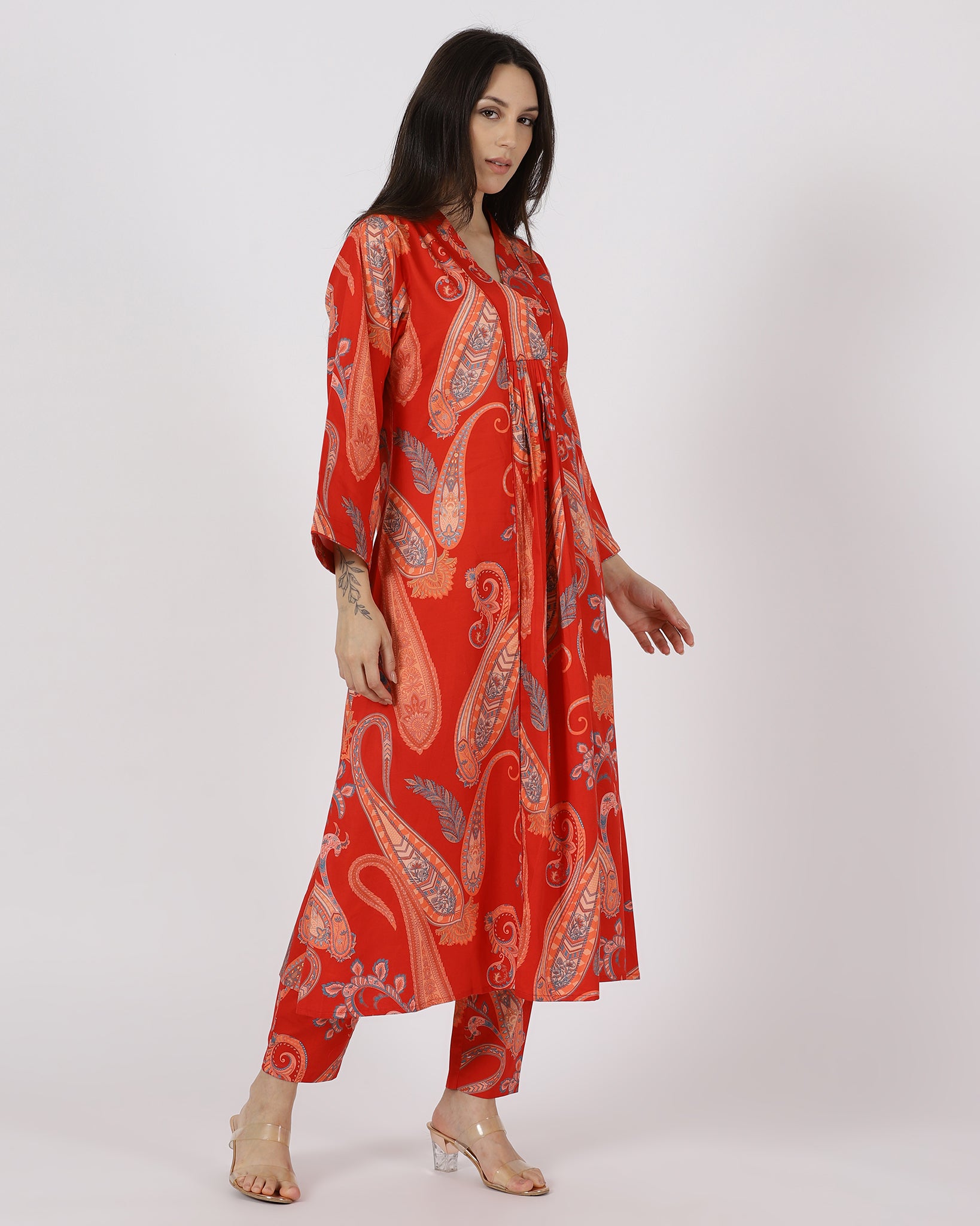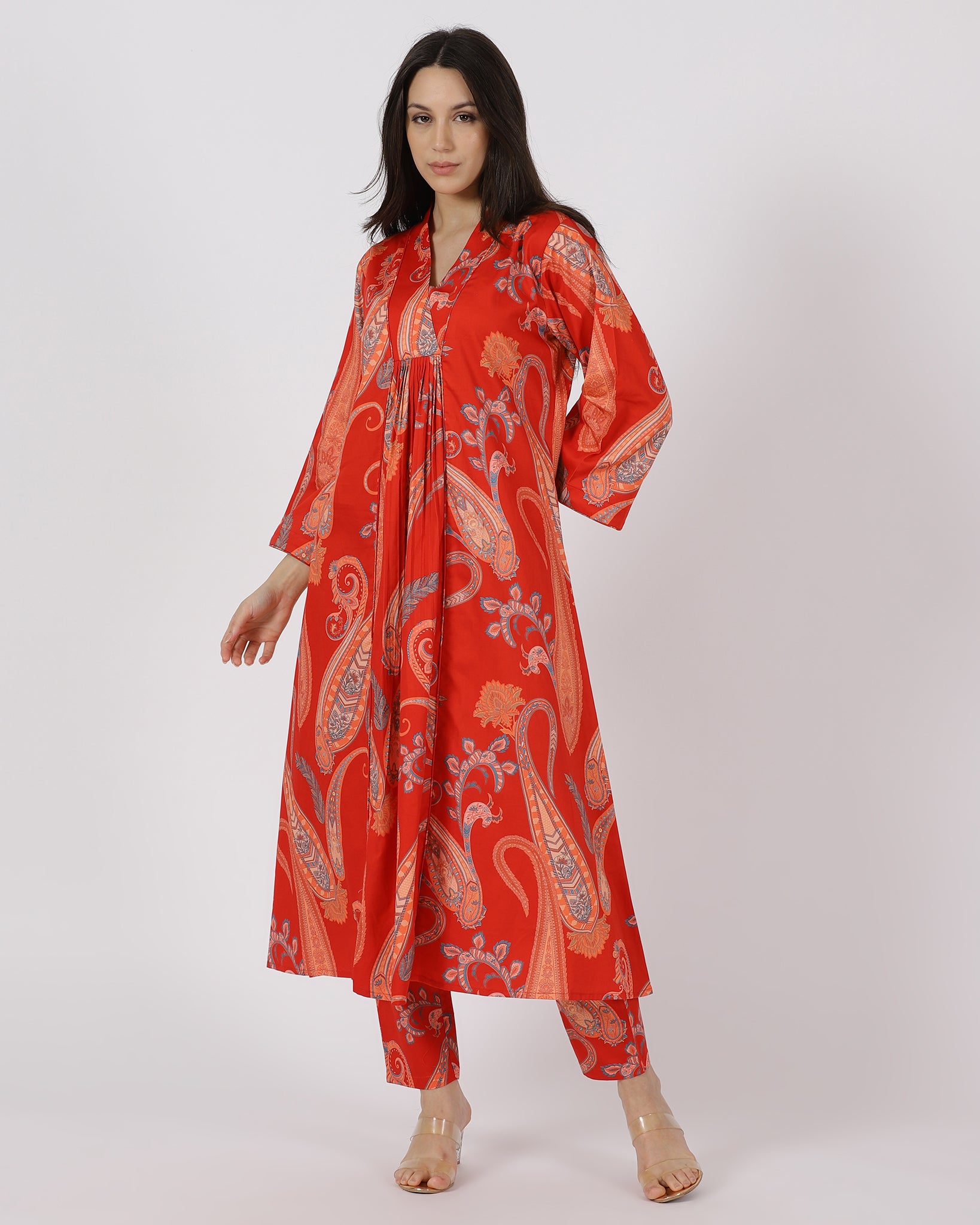 The Scarlet Drift Co-ord Set features a long, flowy top with soft pleating at the neckline, paired with slim trousers in matching paisley. Designed with graceful movement in mind, the silhouette elongates the frame while offering day-long ease. A timeless, contemporary ensemble for the modern muse.