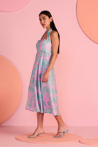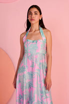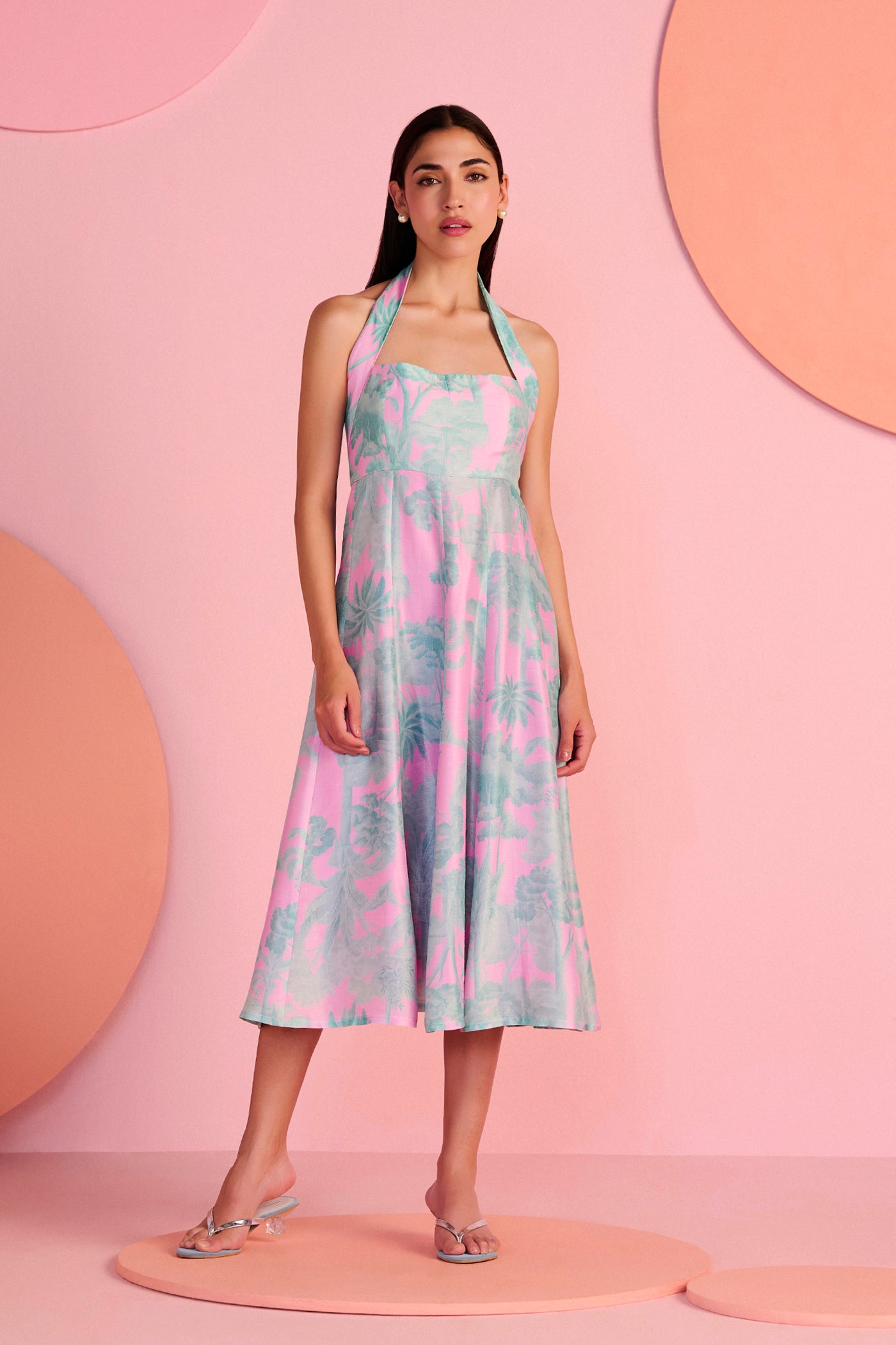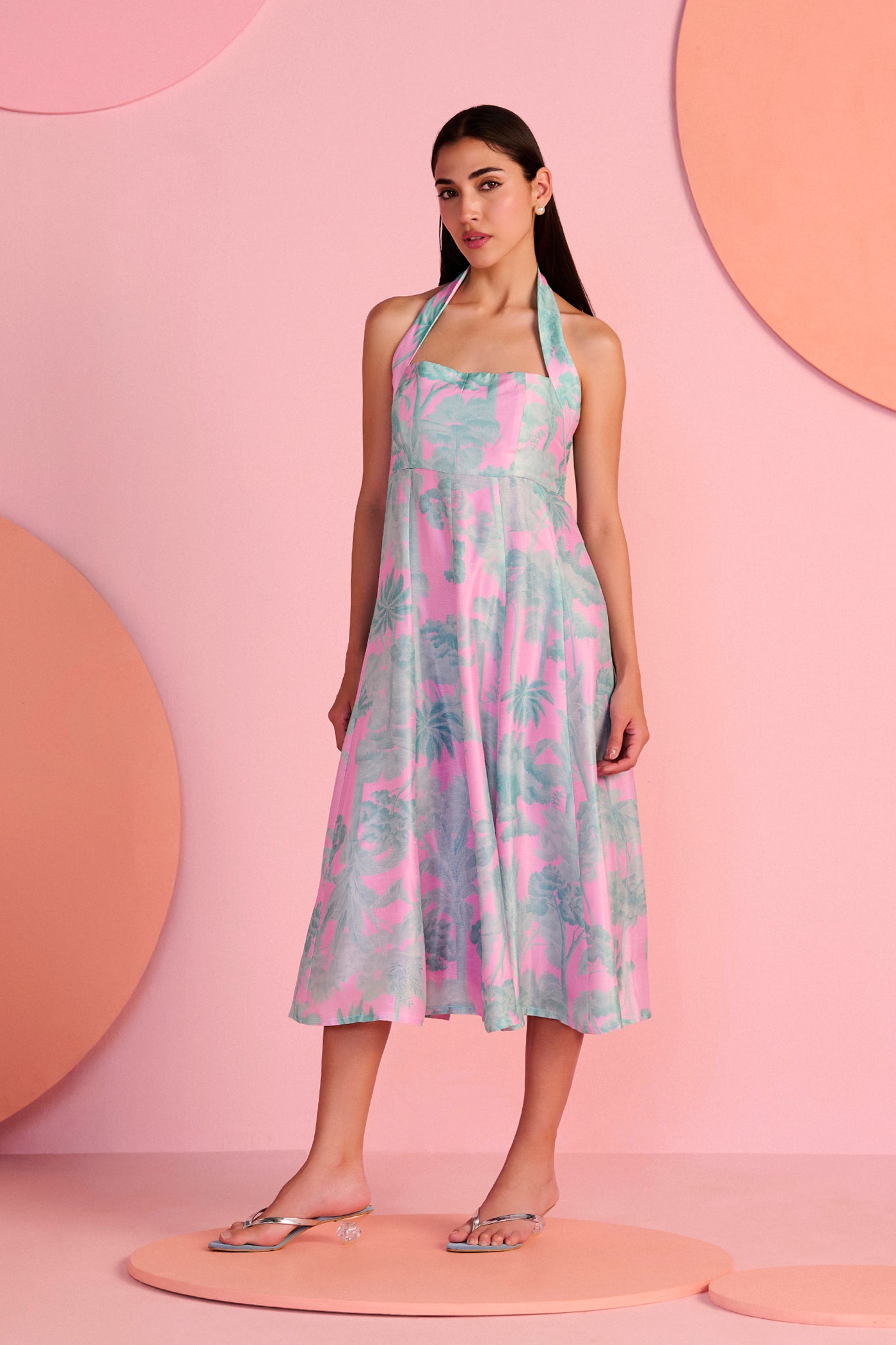 The Blush Loop Dress is defined by its distinctive halter-style loop neckline that frames the shoulders with a modern, elegant touch. The fitted bodice flows into a softly flared midi silhouette, creating graceful movement and a flattering structure. Its delicate blush-toned botanical print adds freshness and softness, while the open back detail enhances the refined contemporary appeal. Crafted in silk, the dress drapes lightly and offers a smooth luxurious finish, making it ideal for elevated daytime dressing and occasion wear.