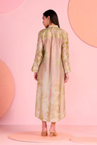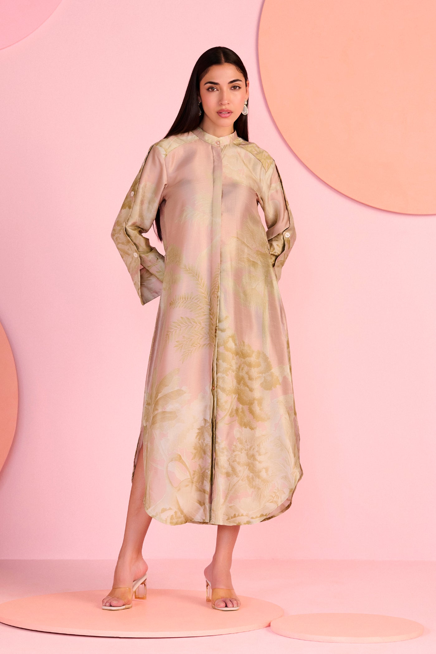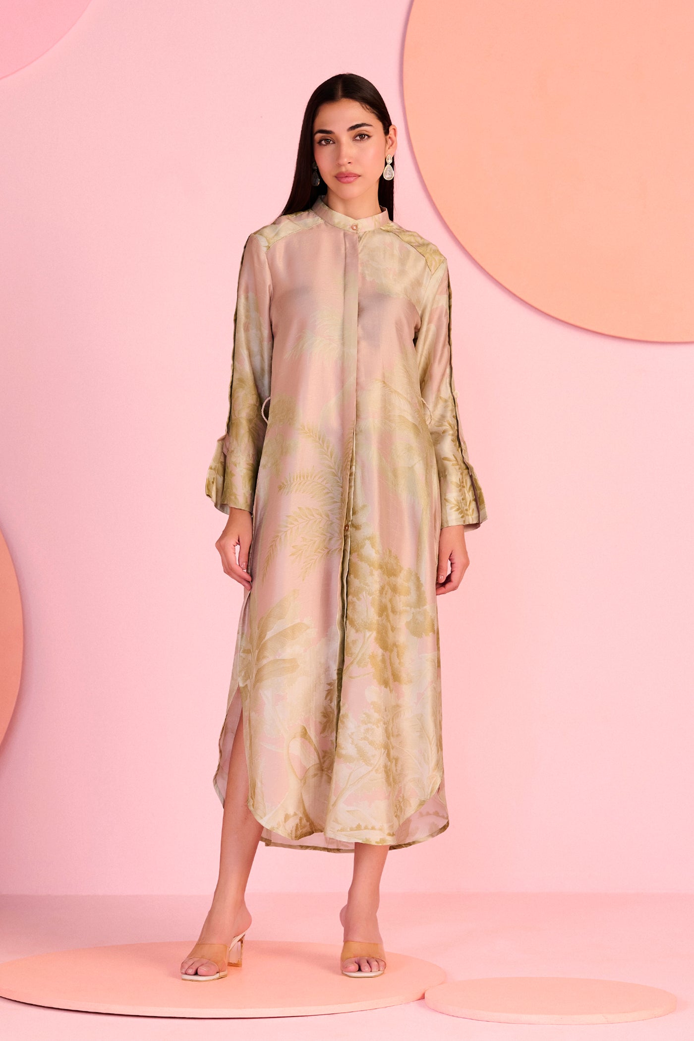 The Blush Muse Maxi Dress features a flowing full-length silhouette with a refined high neckline and concealed front placket that create a clean, elongated look. Soft botanical motifs in muted blush tones add understated elegance, while the fluid straight fall and side slit detail enhance movement and comfort. Designed with full sleeves and a relaxed structure, the dress balances modern simplicity with graceful femininity. Crafted in silk, it offers a lightweight feel and a smooth luxurious drape ideal for elevated daywear and occasion dressing.