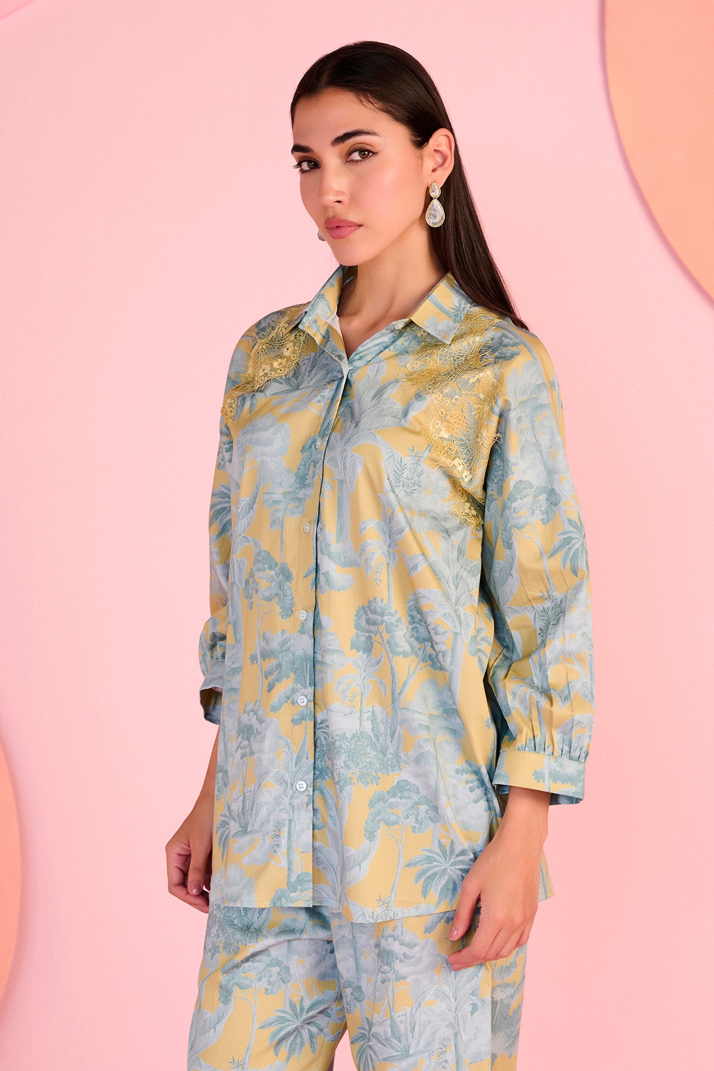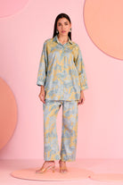 The Echo Co-ord features a relaxed shirt-and-trouser silhouette designed with clean lines and soft structure for effortless elegance. The subtle printed surface creates a calm visual rhythm, while the coordinated set offers both comfort and versatility for day-to-evening wear. Gentle tailoring through the shirt collar and straight-fit pants gives the ensemble a polished finish, making it ideal for refined contemporary styling. Crafted in silk, the fabric drapes smoothly and adds a soft luminous touch to the overall look.