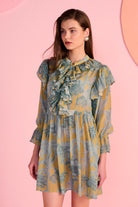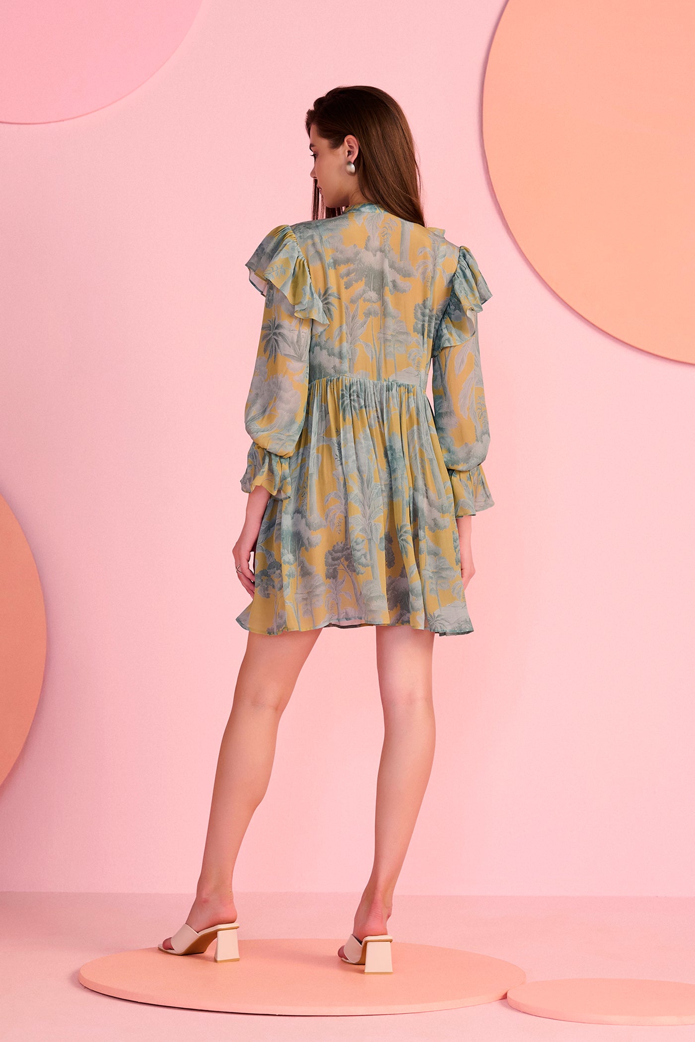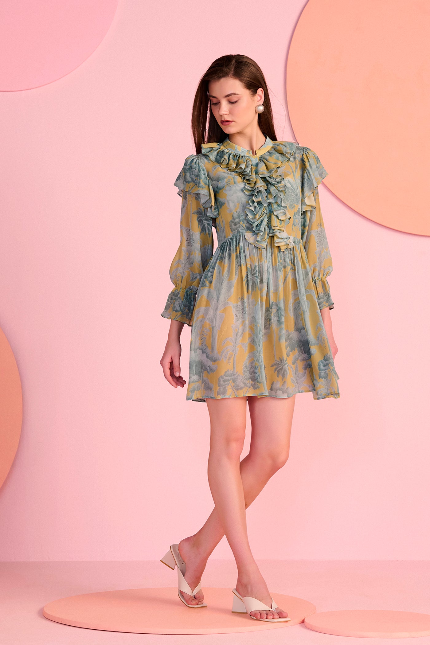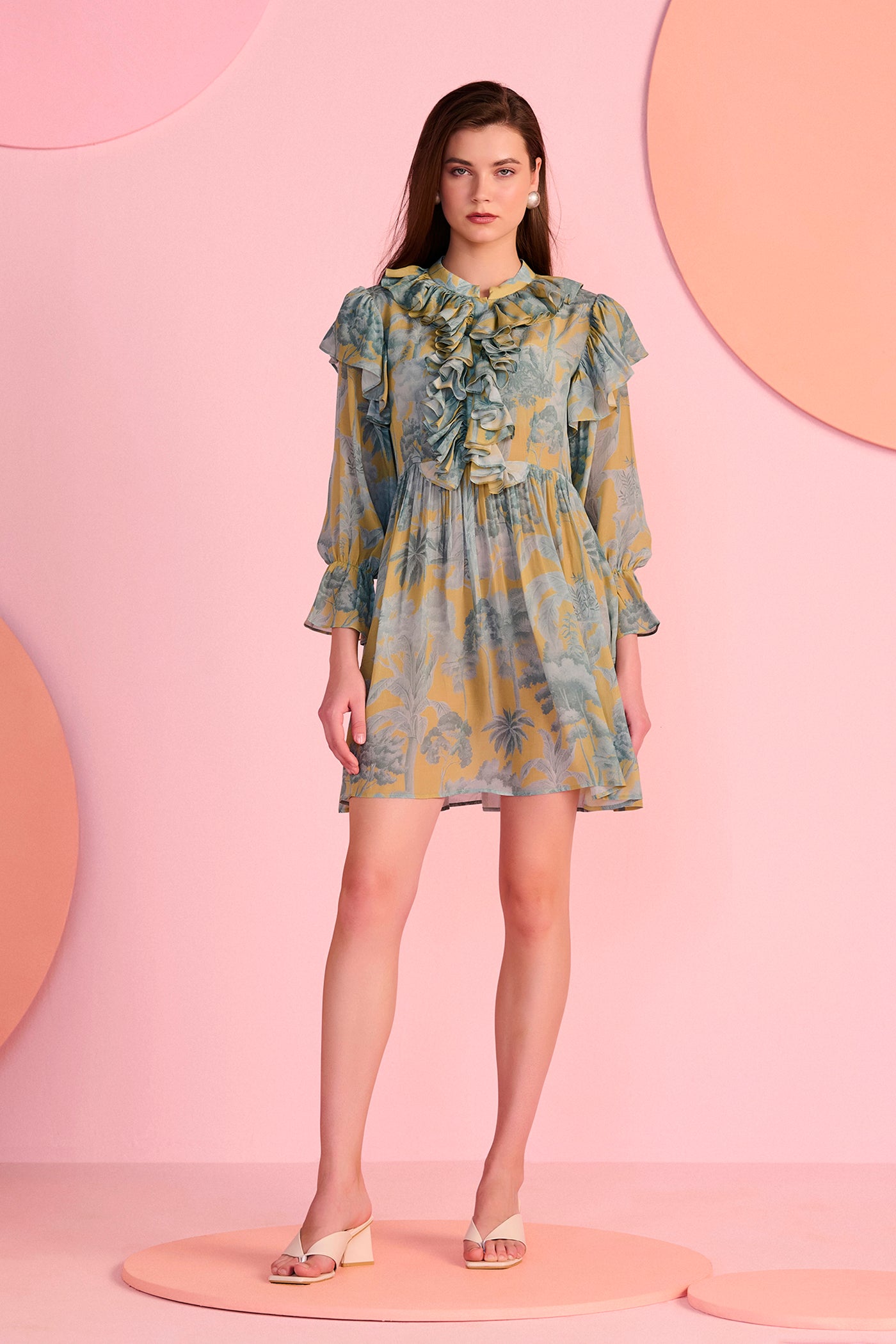 The Fleur Dress features a soft gathered silhouette with cascading ruffle detailing along the neckline, creating a delicate and romantic statement. Designed with full sleeves, gentle volume, and a fluid fall, the dress is enhanced by muted botanical tones that bring depth and elegance to its airy structure. Its relaxed shape offers effortless comfort while maintaining a refined feminine appeal, making it ideal for daytime occasions and elevated casual wear. Crafted with silk for a soft and lightweight finish.