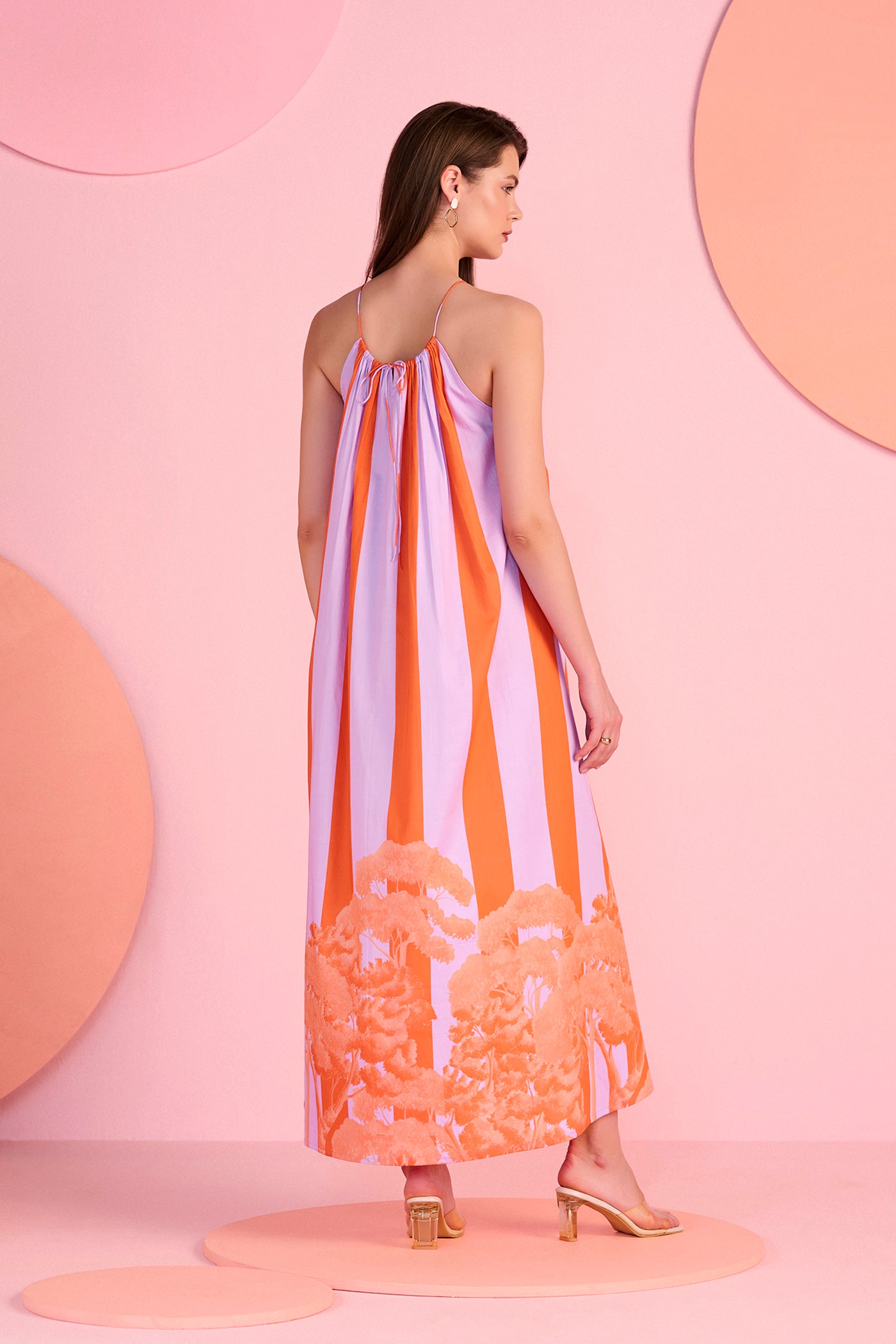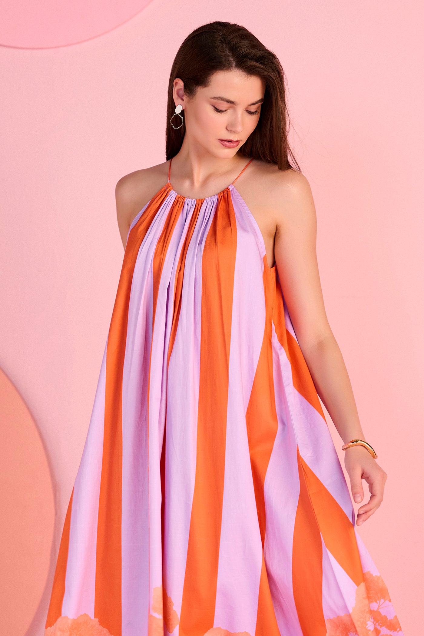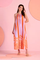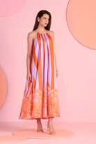 The Pop Willow Dress brings a playful elegance with its flowing straight silhouette and delicate halter neckline. Designed with vertical stripes in vibrant orange and soft lilac, the dress creates a graceful elongated look, while the artistic botanical border near the hem adds signature charm. Its airy fall and relaxed structure make it ideal for warm days, resort evenings, and effortless occasion dressing. Crafted with silk for a smooth and lightweight finish.