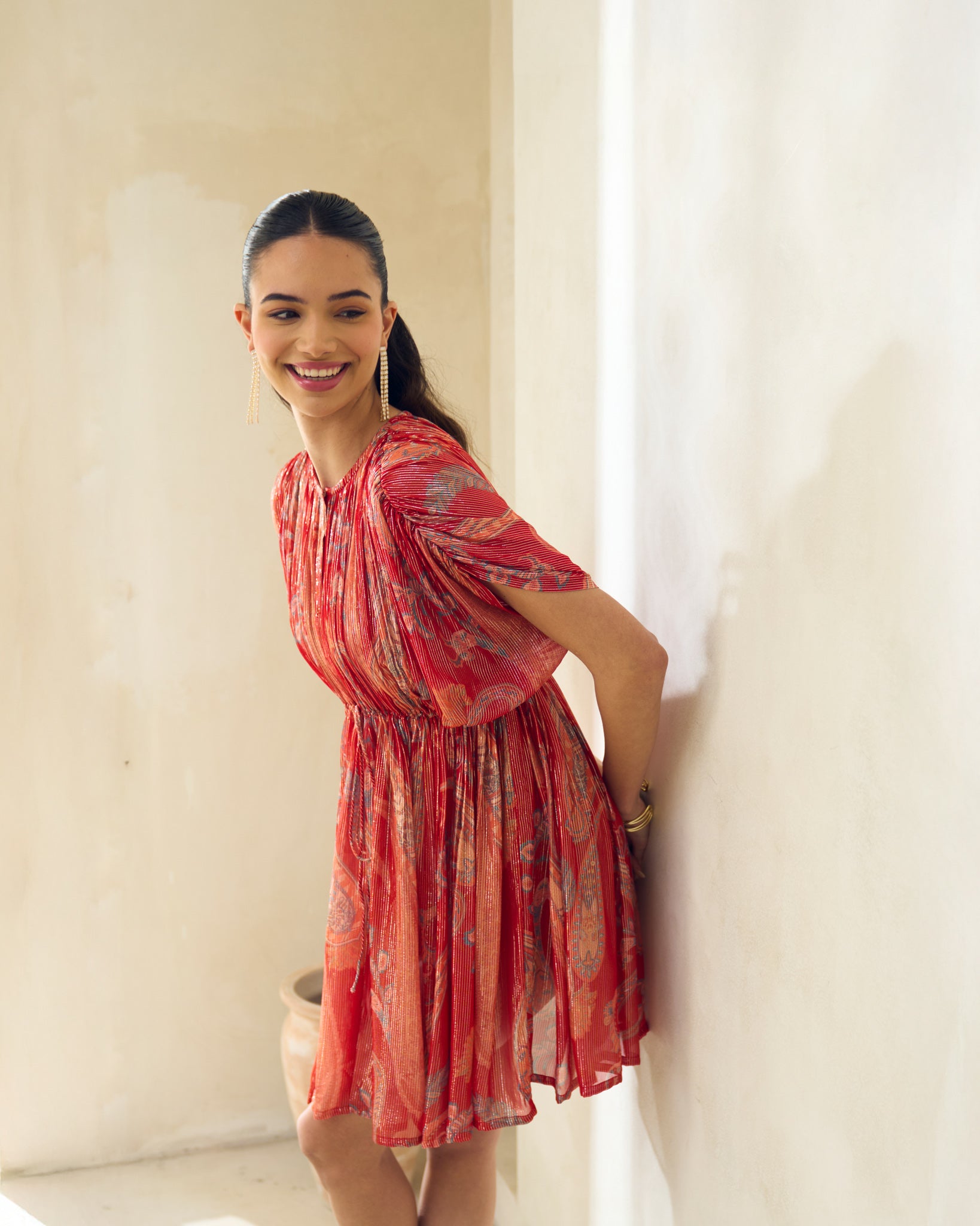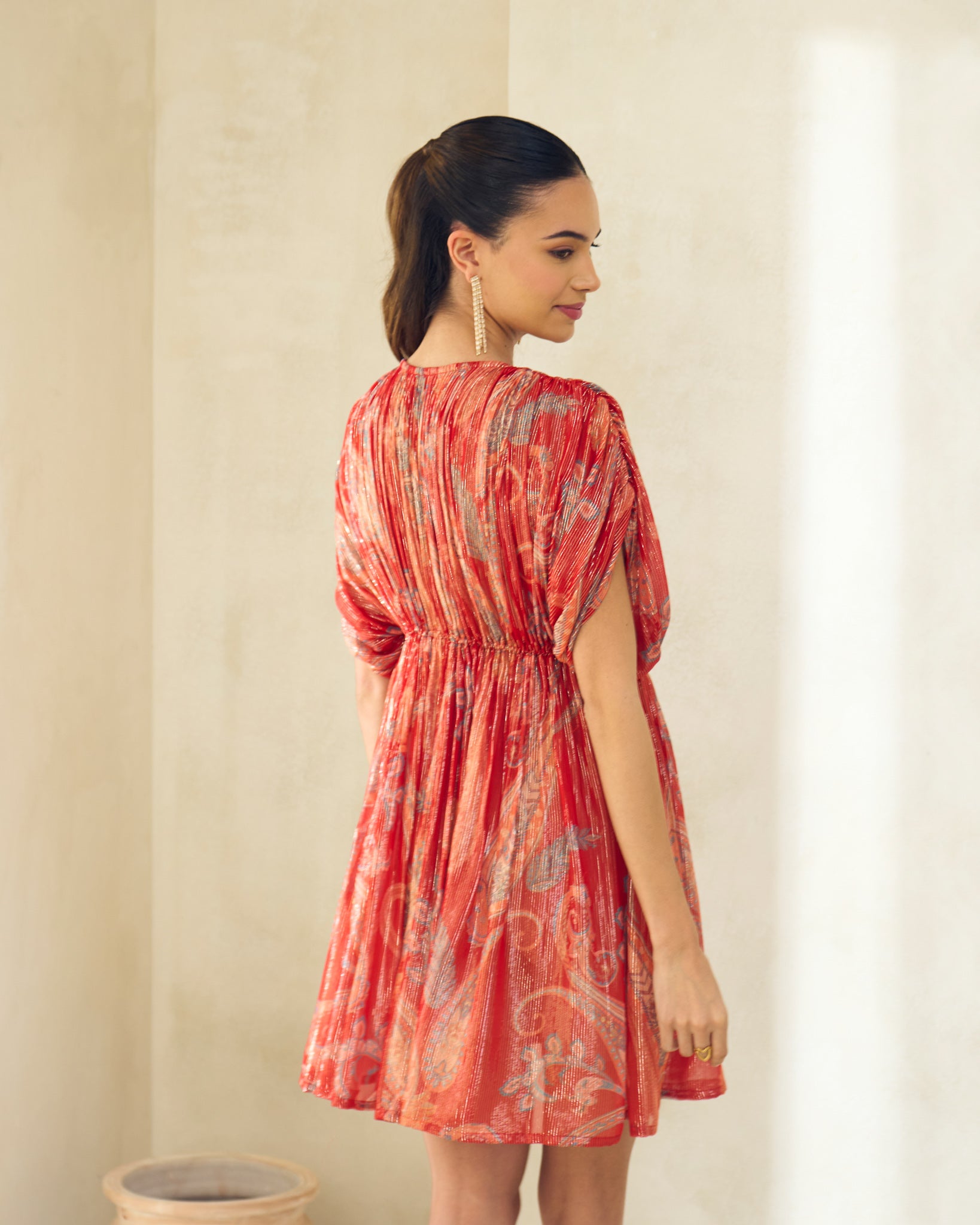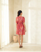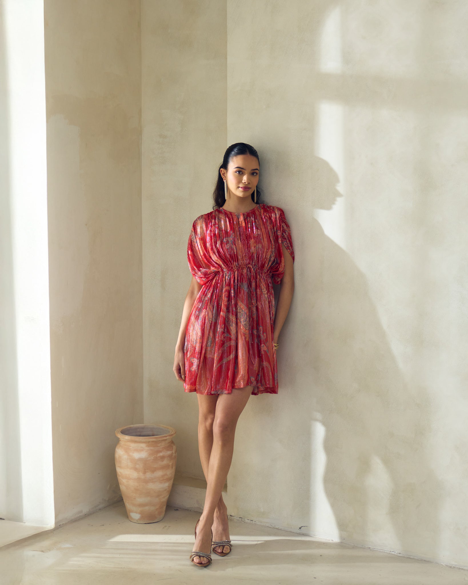 A vibrant, short dress featuring a delicate, sheer red fabric layered over a multicolored print. The dress has a blouson bodice with a defined waistline and draped, butterfly sleeves, creating a light, airy, and celebratory silhouette.