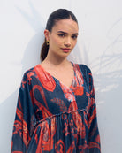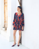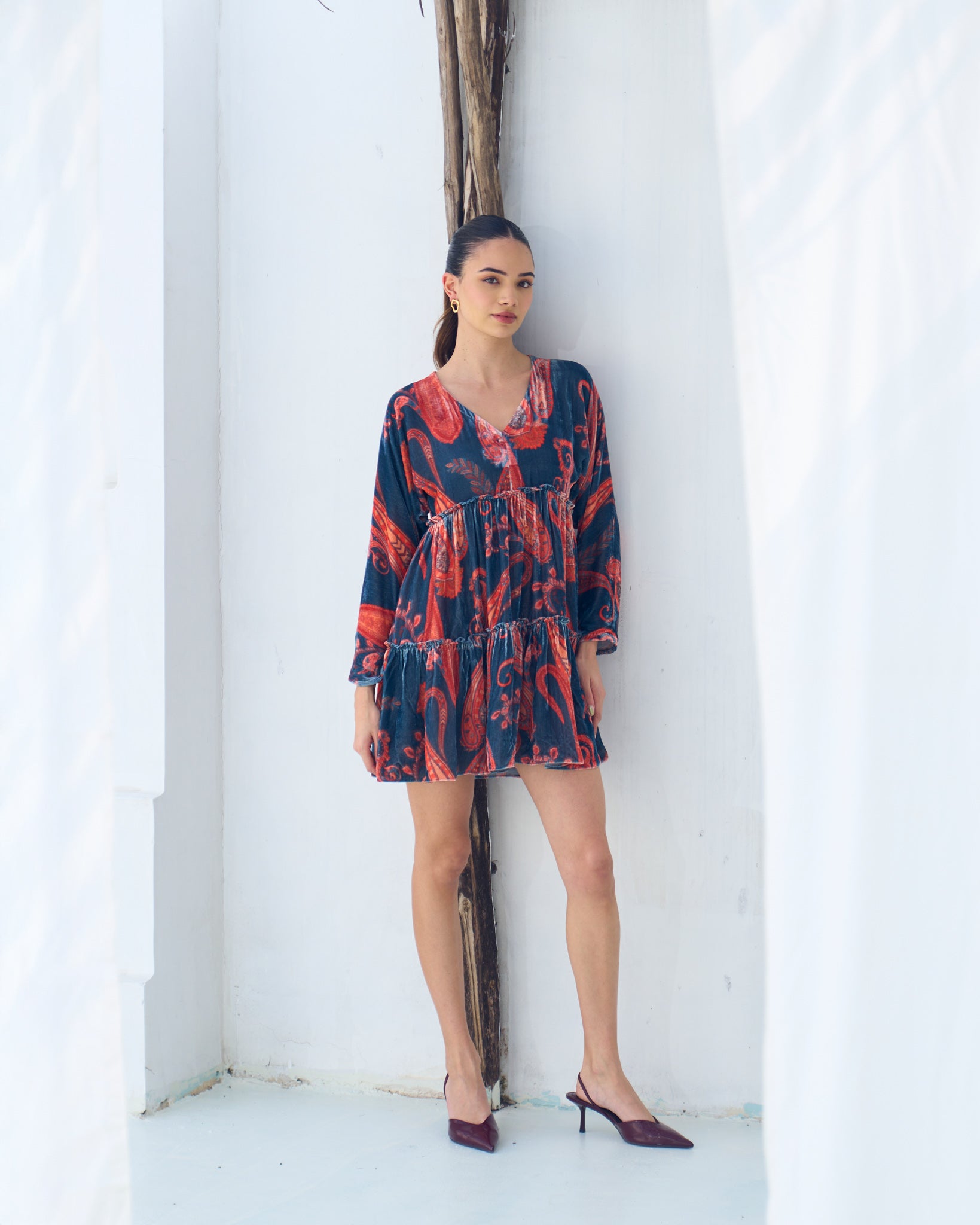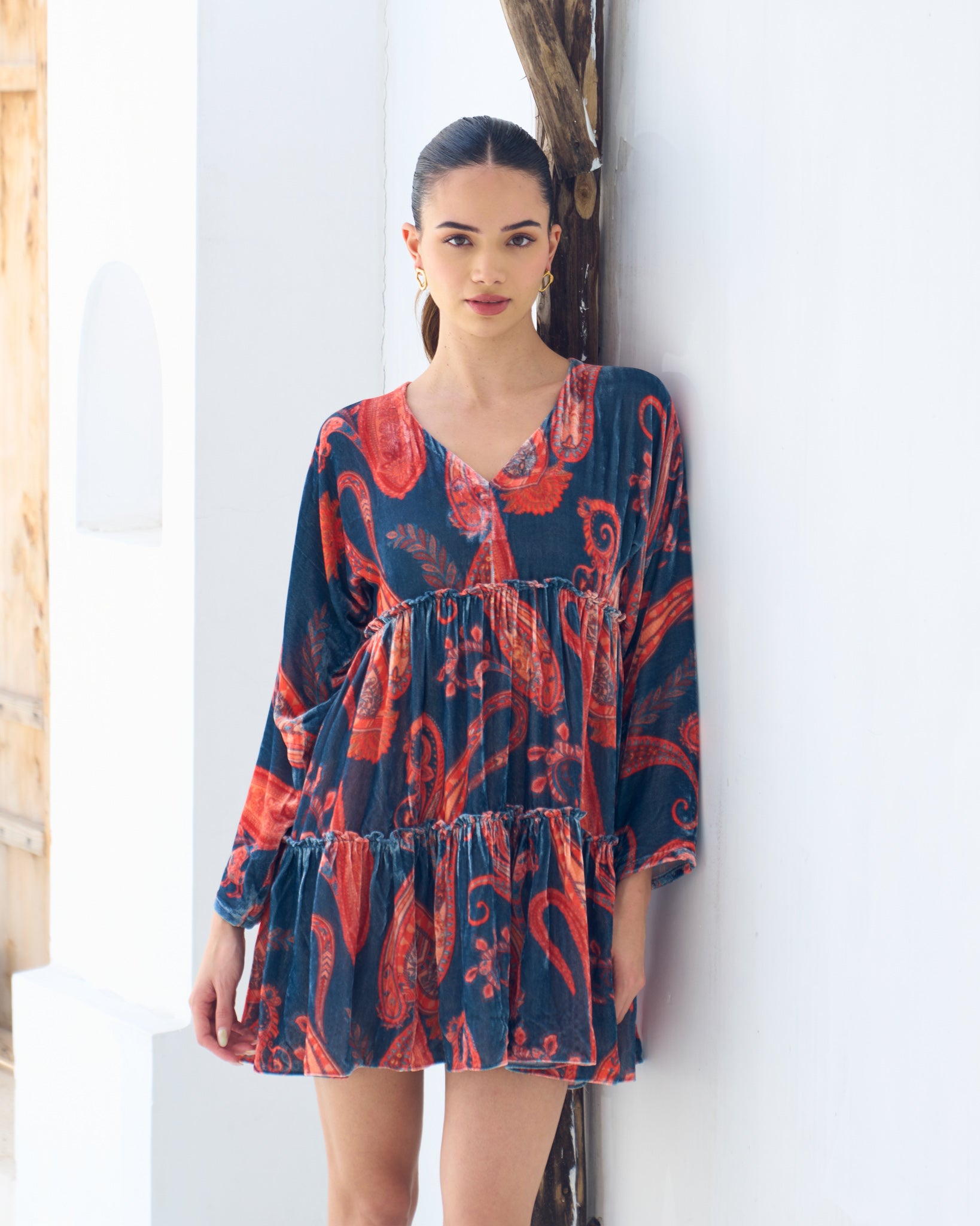 A captivating mini dress featuring a paisley print in deep navy and rich coral-red. The dress has a flattering V-neck, long sleeves, and a tiered, gently gathered skirt that offers an easy, playful bounce. Its rich, deep color and sheen give it an elevated appearance, making it perfect for evening or transitional styling.