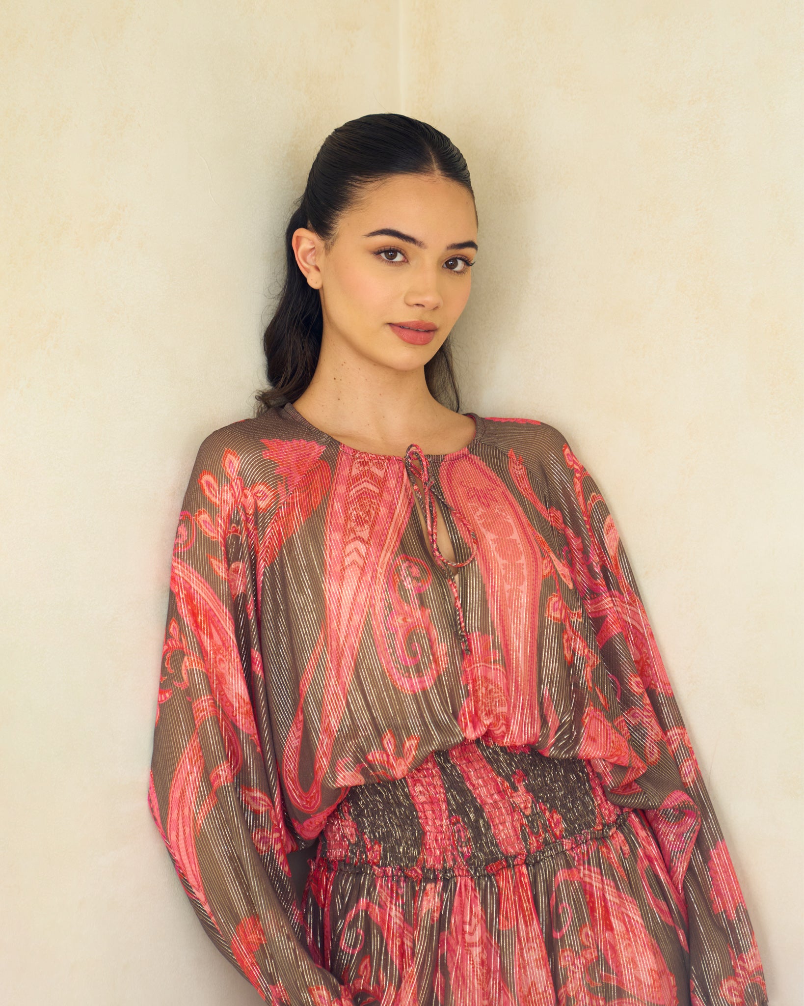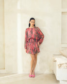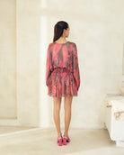 A vibrant mini dress featuring a rich, dark paisley print with accents of pink and metallic sheen. It is designed with a smocked, fitted waist for definition and loose, sheer long sleeves and a relaxed, blouson top, offering a playful yet elevated silhouette.