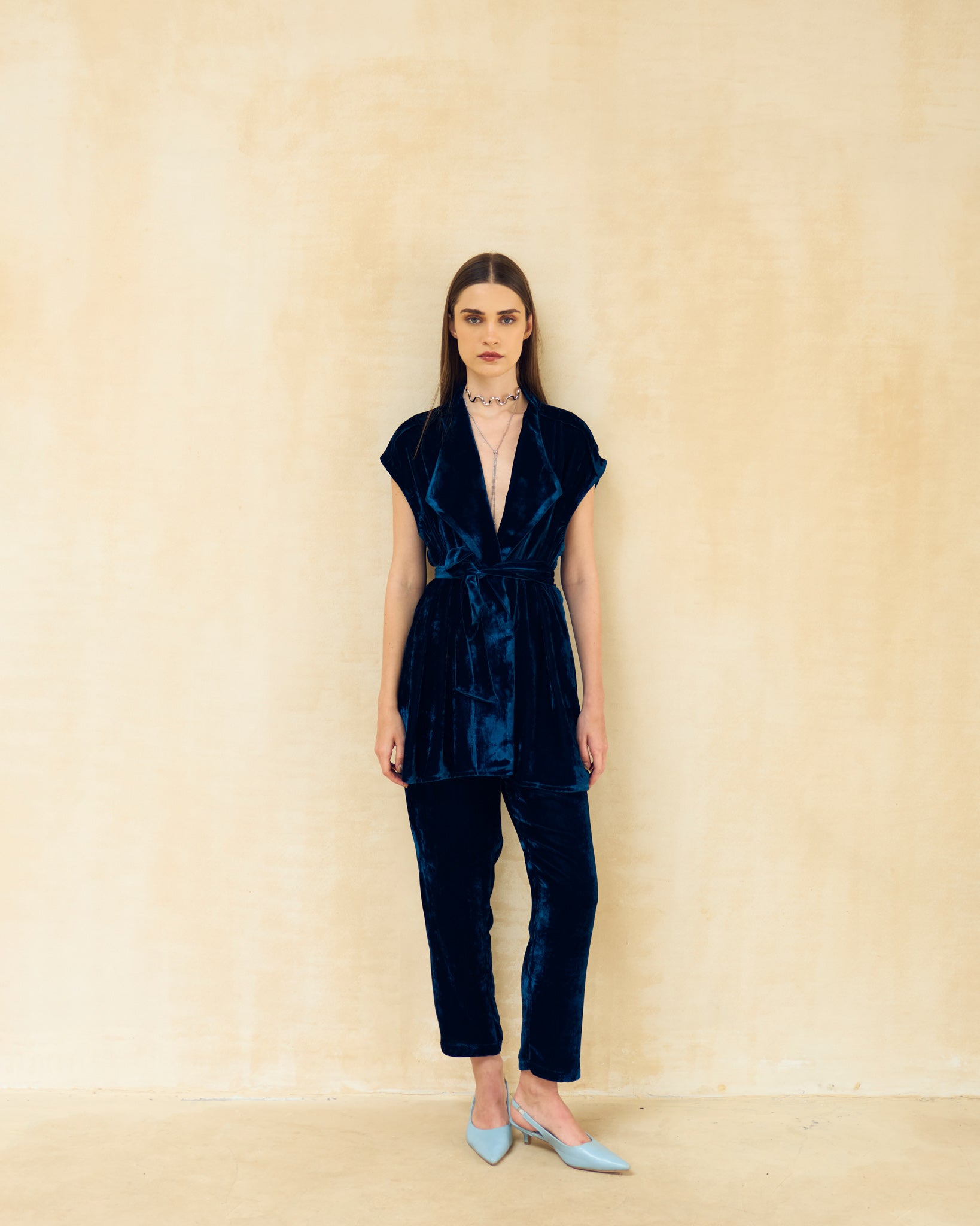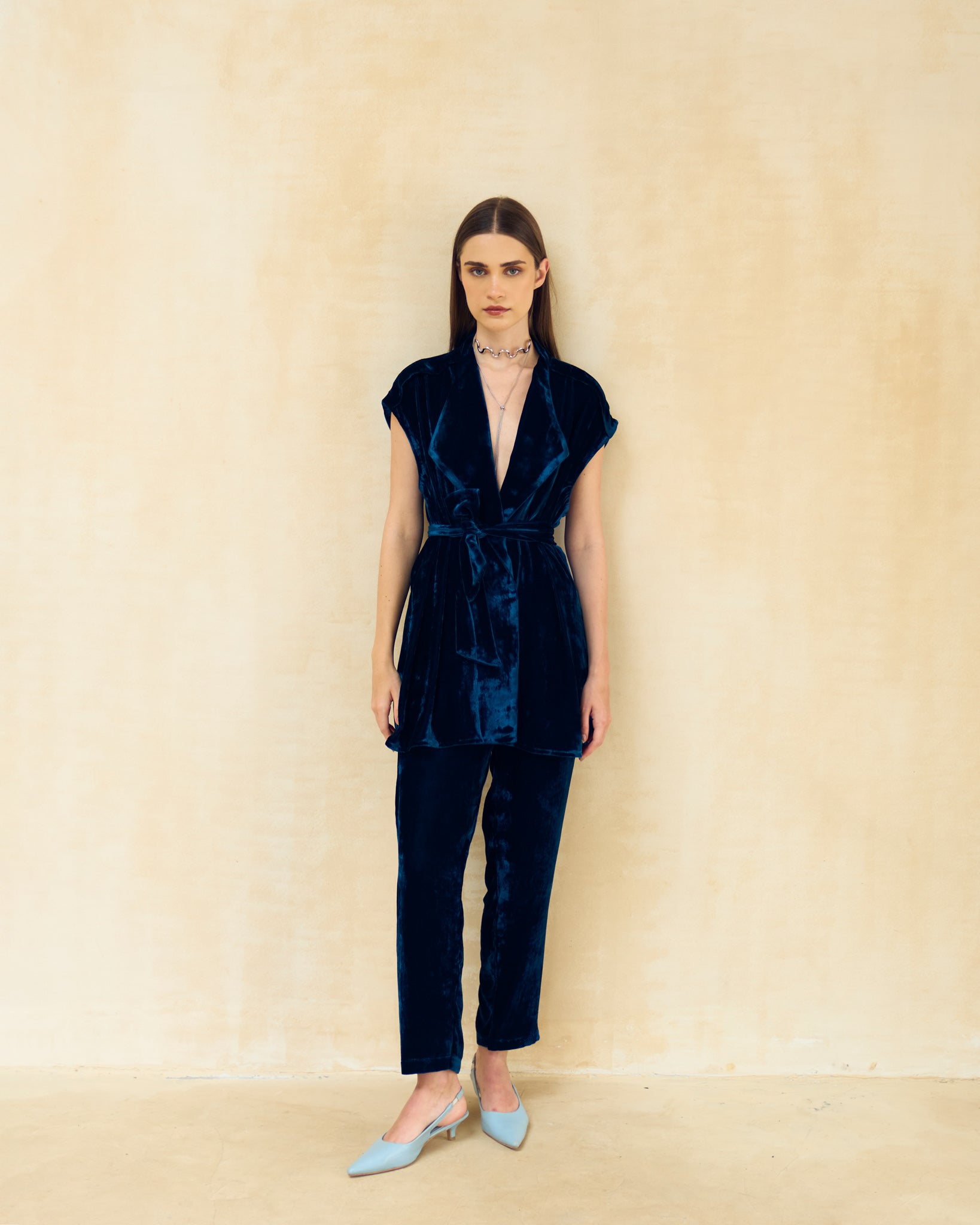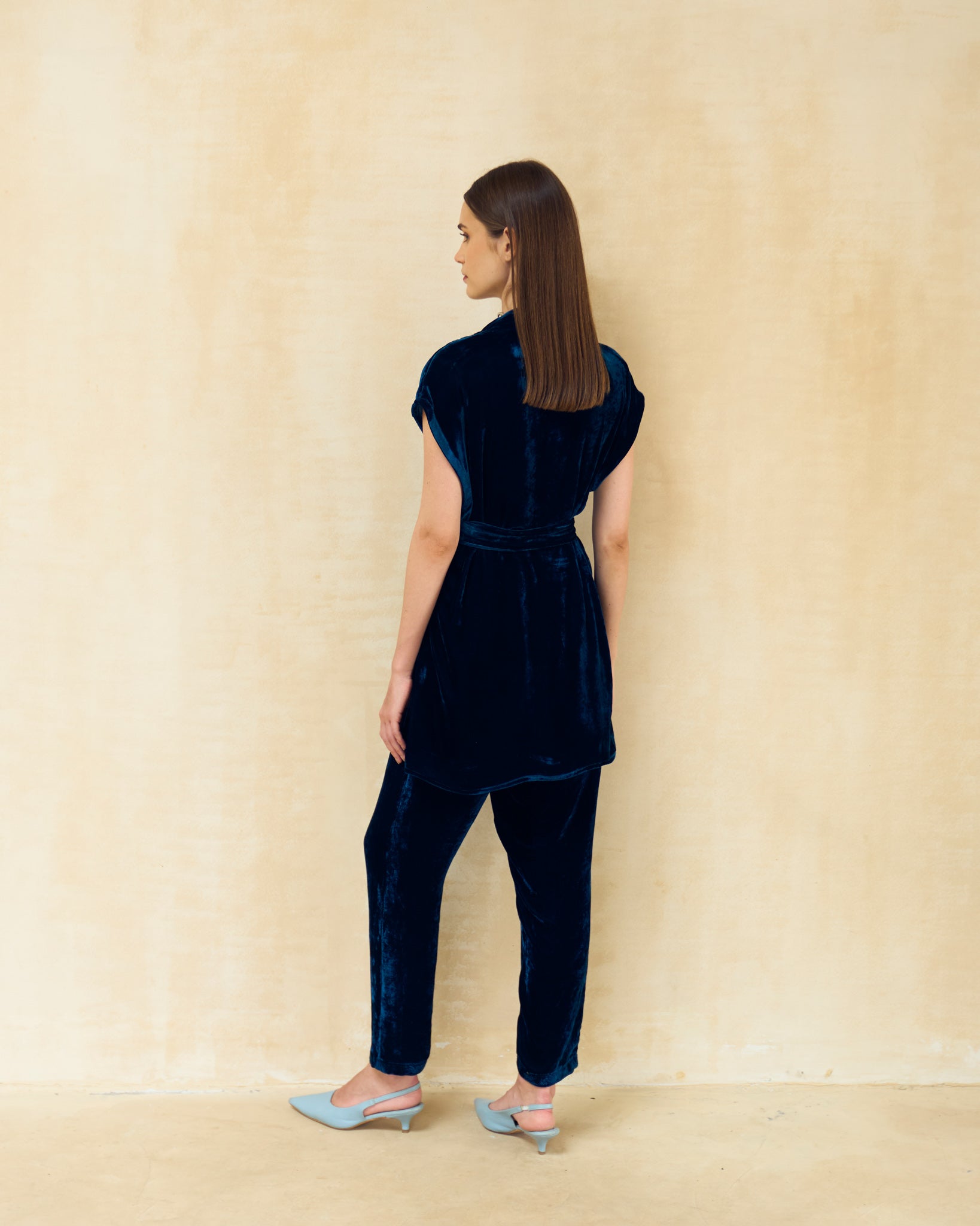This is a sophisticated two-piece co-ord set in a deep, luxurious teal/navy color. The ensemble features a short-sleeved, collared tunic top with a matching belt that cinches the waist. It is paired with elegant cropped trousers to create a sharply tailored, head-to-toe look that is perfect for elevated lounge or evening events.