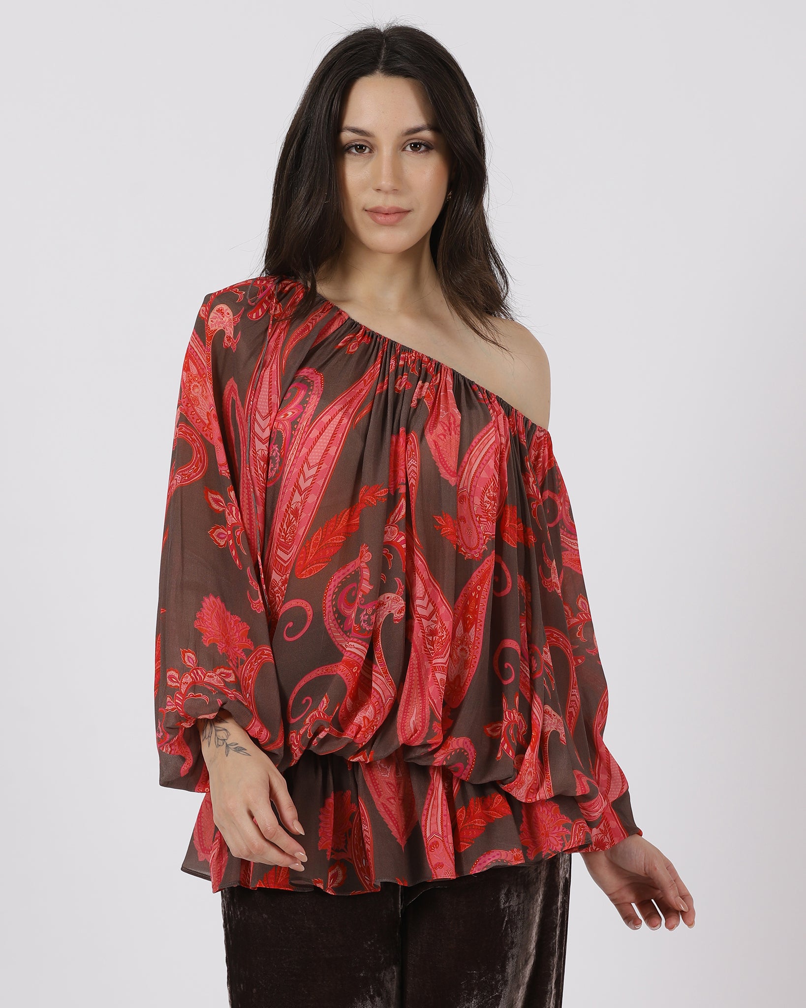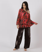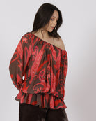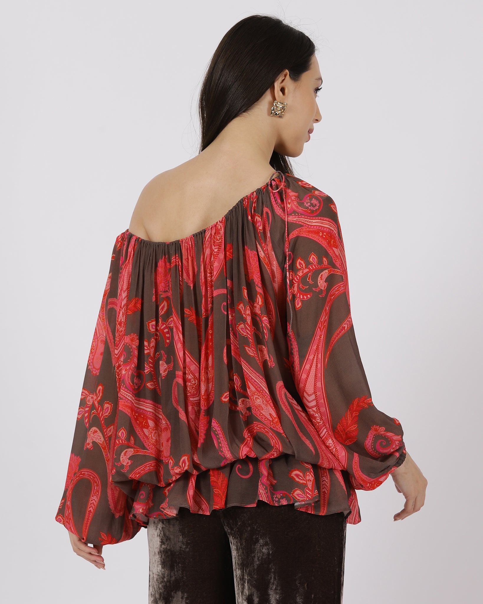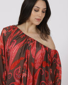 The Rouge Aura One-Shoulder Top and Pants showcase a dramatic, airy silhouette draped in vibrant paisley. The gathered neckline and voluminous sleeves create a soft, billowing shape that moves with grace. Designed to make an effortless statement, this piece blends modern asymmetry with timeless print artistry.