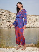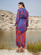 The Blue and Red Frosted Pants offer a sleek, straight fit that elongates your frame while maintaining ease of movement. Their lustrous Bemberg satin fabric adds elegance and sophistication to any occasion.