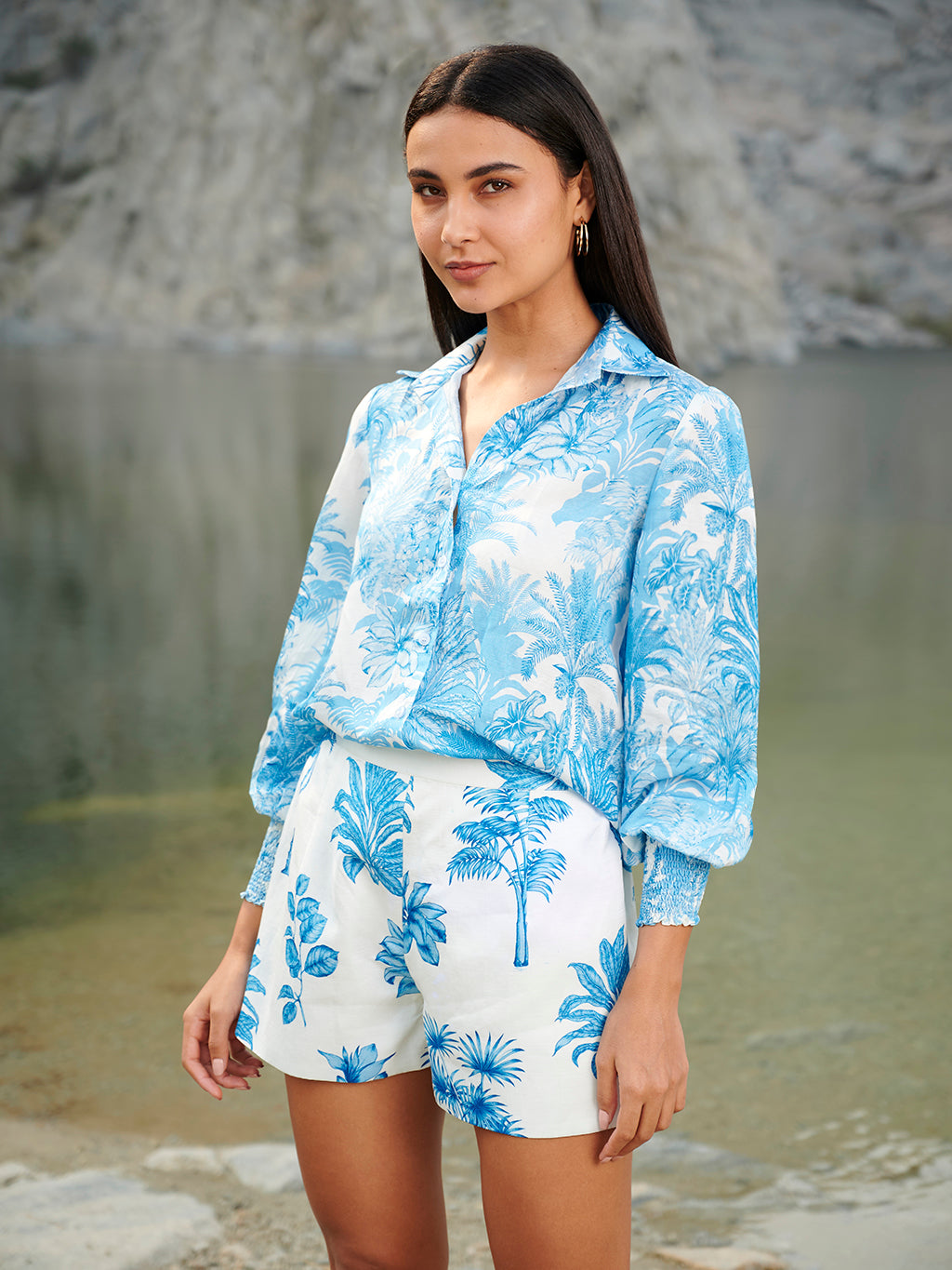 The Blue Kai Shirt celebrates understated elegance with its delicate prints and refined finish. Made from lightweight Bemberg linen, it offers a breezy fit and all-day comfort, radiating effortless sophistication.