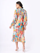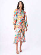 The blue soiree rouched outfit has an elasticated closed neck with uniform pleats accompanied with a balloon sleeve and an elasticated cuff. The uneven crunched bottom with a tie up adds more authenticity to the garment. The digital prints used are more joyful and radiant. The outfit is made of natural bemberg satin which glides through the skin.