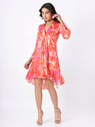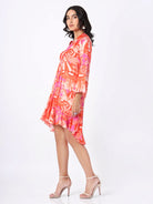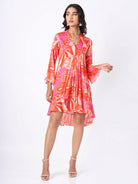 The pink Damsel dress has an extravagant V neckline along with a mini bell sleeve with digital eye-catching print is the highlight of this dress. The dress has been made more special with the pleats that has been uniformly arrested in the midriff area with an uneven hem which adds more joy to the outfit. The natural Bamberg satin used in this outfit provides a luxurious look with a communication of comfort.