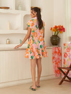 Where modern charm meets classic elegance. Featuring a flattering gather detail at the waist and a delicate tie detail at the neck, this dress exudes effortless sophistication. Perfect for sunny days and special occasions alike, crafted with floral printed bemberg crepe fabric.