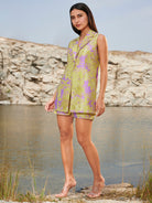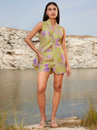 Tailored to perfection, the Purple Yellow Diana Shorts complement the blazer top with effortless grace. Crafted from soft Bemberg silk, they feature vibrant floral prints that exude confidence and charm.