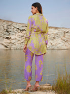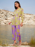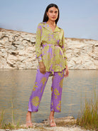 The Purple and Yellow Frosted Pants offer a sleek, straight fit that elongates your frame while maintaining ease of movement. Their lustrous Bemberg satin fabric adds elegance and sophistication to any occasion.