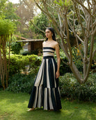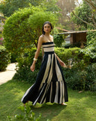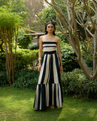 Falling into bold vertical stripes, the wide-leg bottoms create a lengthened silhouette, balancing ease with sophistication. The seamless flow from top to bottom makes it a statement piece in motion.