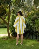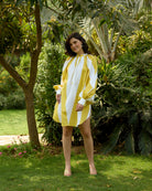 Clean, bold vertical stripes create a graphic rhythm that elongates and flatters, enhancing the dress’s effortless drape.