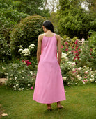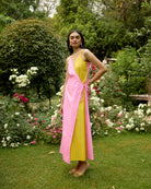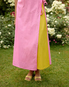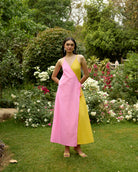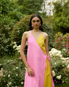 The pink swing dress unique wrap-style dress features a beautifully draped outer layer that cascades elegantly on the wearer, creating a flattering and flowing silhouette. The design showcases a captivating color combination of a soft yellow inner layer contrasted by a vibrant pink outer wrap. This interplay of colors adds a playful yet sophisticated dimension to the dress, ensuring a stylish and eye-catching appearance for various occasions. Made with high quality Giza cotton