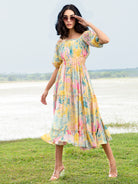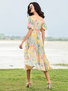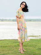 The amber dress was made keeping house of soi tagline in mind " flirty and feminine " and this dress does perfect justice to the same , can be worn on shoulder as well as off shoulder they have cut out details at the waist and is dressed down by two layers of natural bemberg crepe fabric.