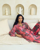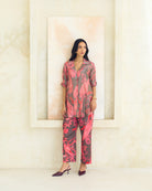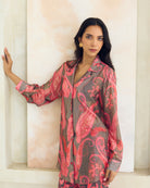 A stylish two-piece set featuring a detailed paisley print in rich tones of brown, pink, and grey. The top is a relaxed, button-front shirt with a classic collar, creating a chic look. It is perfectly matched with full-length, straight-leg trousers for a unified and sophisticated statement outfit.