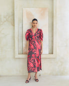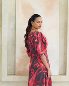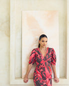 This sophisticated Haven Halter Dress features a striking paisley print and a midi silhouette that beautifully highlights the wearer's figure. The flattering V-neckline and gentle gathering at the bust lead into a skirt that falls gracefully, while the structured puff sleeves add a dramatic, stylish touch. This piece is perfect for an elegant event, offering a blend of modern flair and effortless charm.