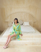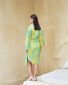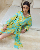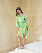 A bright, resort-ready dress featuring a striking aqua and yellow print in a silky material. It’s designed as a shirt dress with a pointed collar and long sleeves, but the style is transformed by a large front knot that creates a flattering drape and a high-slit, asymmetric wrap skirt. It's the ideal blend of polished and playful.