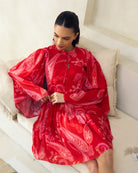 A playful mini-length dress in a bright, vivid red and pink paisley print. The design features a simple, round neckline and a lightly gathered waist, leading to a flirty, swinging skirt. The look is completed by voluminous bell-style long sleeves, giving the dress an airy, celebratory movement.