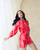 A flirty, two-piece set in a vibrant red and pink paisley print. It features a button-front top with a deep V-neck and adjustable ruched sleeves, paired with comfortable, high-waisted shorts.