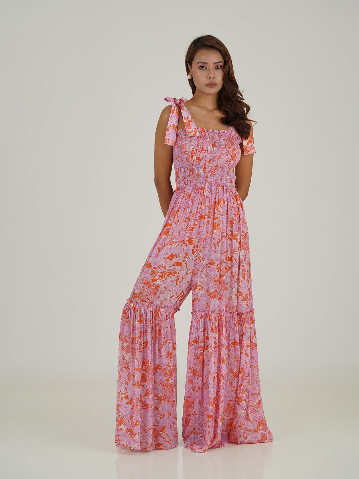 The savana jumpsuit is a fun playful dress perfect your day. the dress is crafted in soft and light bemberg crepe. with a smocking detail at the yoke and tie up sleeveless straps.