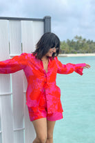 The pink poppy co ord set comes with a buttoned down shirt and shorts that can be styles in different ways , made of luxurious bemberg silk this 2 piece set is sure to glam you up .