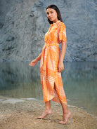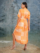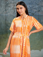 The Clementine is the definition of chic elegance with a shirt style long dress with a stylized curved hem , buttoned down and tied in the front . The bright color gives it an effortless and fresh look perfect for your days.