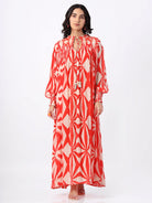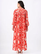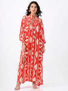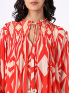 Our Red Hooley dress is with pleated neck and smocked cuff area, tassels are given to tie the neck open. Digitally printed fabric made of Bemberg crepe giving maximum flow to the breezy style.
