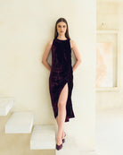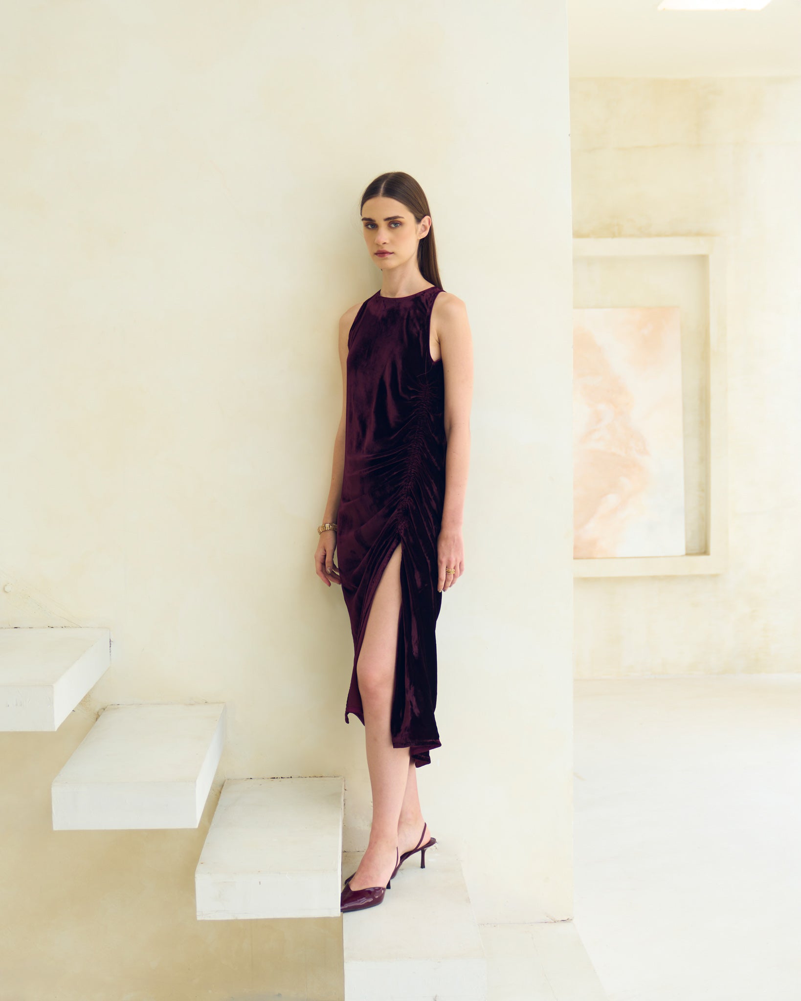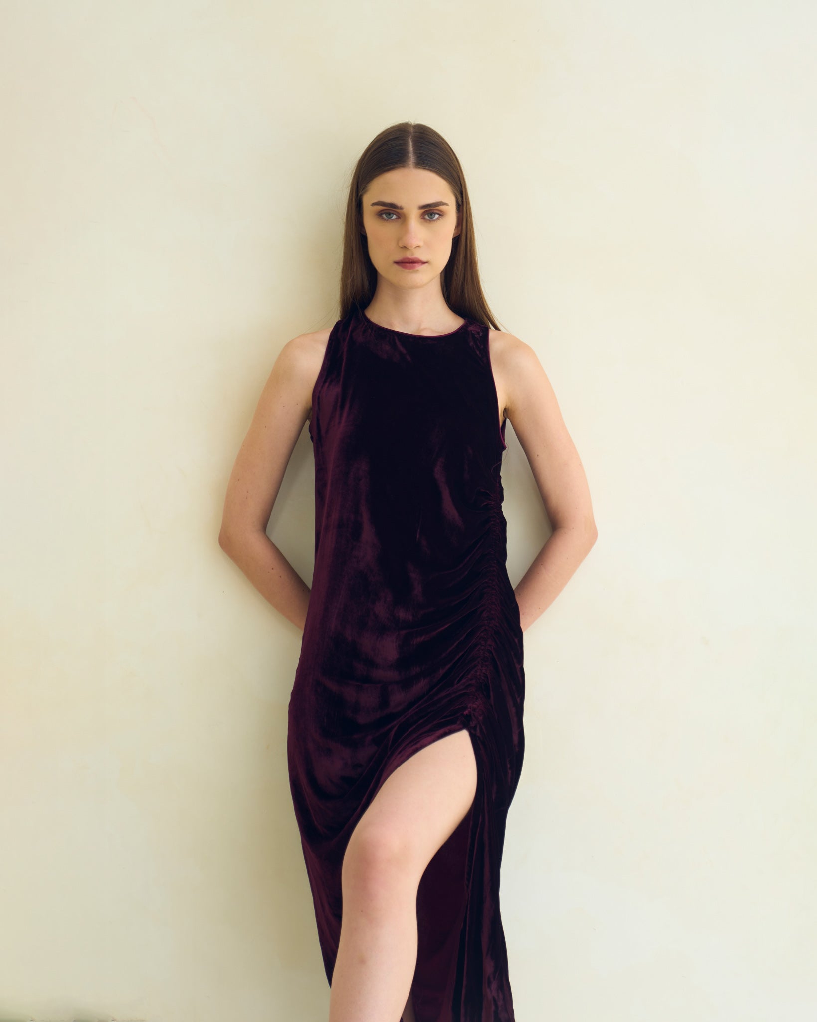 A striking evening maxi-length gown in a deep, rich burgundy color. It features a simple, high-neck, sleeveless bodice with dramatic gathering/ruching down one side, creating a flattering silhouette that culminates in a confident, thigh-high slit. The look is pure, dark elegance.